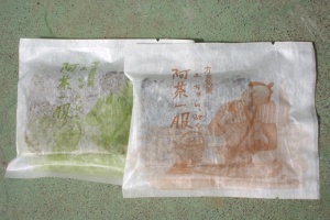 吾妻町原町の藤井屋政右衛門という店で販売されているお菓子. その名もズバリ! 方言銘菓 阿茶一服(あちゃいっぷく) 「あちゃ」は吾妻地区の方言で、「それでは」の意味. 阿茶はお茶菓子ということで、当て字なんだんべけんど、それでも自ら「方言銘菓」と名乗っているところがすげぇ! みなさんのお住まいの地域でも、方言をベースにした名前のお菓子、ねーんきゃ?? |