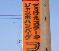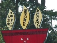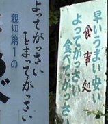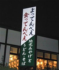 ひろ吉@月夜野さんがデジカメで撮影、送って下さった看板. 水沢観音近くにあんだそうだぃね. 上のの高崎インター近くの看板の本店みて. 「食ってんべぇ」の表記も. でももし東毛なら 「よってぐんべぇ」「くってぐんべぇ」に なる頻度が高けぇんじゃねーかなーと思うんだけんどねー |