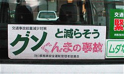 | おめーさん、このステッカーを貼った車、見た事ねぇきゃ? 群馬の「グン」とかけているんだんべけんど、どーみても「グソ(ぐそ)」に見えねぇっきゃ? 県の社団法人が作っているみてぇだけんど、ウケを狙ったんか?それともマジなんか? 最近はこの「グソ車」も少なくなりましたぃね. 通勤途中にめっけると、つい見とれちまうんだぃねぇ・・・ |
