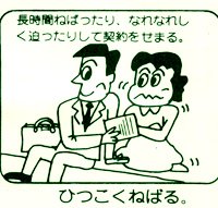 桐生市のY新聞に入っていた新聞店の折込広告. 新聞の強引な勧誘例を紹介したイラストのヒトコマ. 良く見っと、「ひつこくねばる」 . 全国的には「しつこく」であり、これは「し」が「ひ」に転訛した「逆江戸っ子現象」.同様な例では、数を数えるとき「7:しち」が、「ひち」に変わるのを良く耳にすらぃね. これを桐生の人に見せたら、「どこかおかしいかわからないんだけど・・・」とゆわれたで(笑) この広告を作った人も、写植・校正をした人も、読んだ人も気づいていない.(!) これぞ「方言」の典型例であり、感涙を覚えずにはいられなかったぃね. |