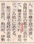 上毛新聞平成14年6月17日紙面から.赤傍線編集者挿入. 「粕川を花の道に」という記事の一部.さすがは地元紙!これぞ鑑! 記事中、堂々の「水くれ」である.群馬では決して「水やり」じゃねぇんだぃね! 同じマスメディアでも、郷土での発音を無視して東京発音を続けるFMぐんまの厚顔無恥な女子アナどもに、この記者の爪の垢を煎じて飲ませてやりてぇ! 「水くれ」が実り、なっからきれーな道ができるのをお祈ってるで. |