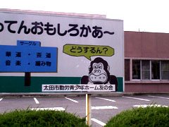 太田市下浜田町にある 勤労者青少年ホーム(WILL-BE館)の入り口にある看板. 「ばってんおもしろかぁ〜」はあえて九州弁を意識したのでしょうか?(制作者の意図が不明なのでなんともゆえねんだけんど、太田では「ばってん」は使わねぇと思うんだけんどけど・・・なんなんだこりゃ?) ゴリラの話してる吹き出しの中をよくみてみっと・・・ |