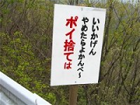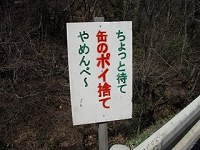 T先生から看板の情報もらったんで、 桐生市堤町の現場までちょっくら撮影に行ってきたで。 こりゃいちよー「警告看板」なんだんべけんど、 「よかんべ〜」の「〜」のおかげで 警告っつーよりは、なんかばかにフレンドリーな感じになってらぃねぇ・・・・ それに桐生なら「いいかげんよすべぇよ ポイ捨ては」のほーが、 まっと群馬弁度が増すんじゃねぇんかって思うんだけんどね。 |