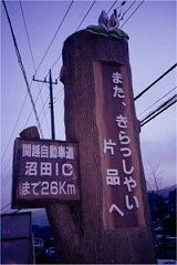 (ちょうど、サエラスキー場に向かう県道に国道から曲がる角の少し沼田寄り) 「また、きらっしゃい」(どーやら片品村役場製作らしい.) 通常のタイプの道標なら「またお越しください」か、「またいらっしゃい」なんでしょうけど、尊敬表現もなく、飾り気もないストレートな村民の叫びを記したこの道標は、スキーにきた東京人にはどう映ってるんかねぇ? いやいや、片品村民の方はみな「さくい」方べぇなんだんべね、きっと.. |