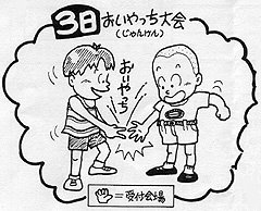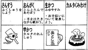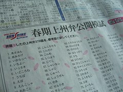 左は、小学校で配られたプリント. おんがくのところをご覧下さい. 「手をはたきながら歌おう」って印刷されてらぃね.群馬では手は「たたく」ものではなくて、「はたく」ものなのです.「拍手」も「てばたき」ですもんね. ちなみにその右の「カルタくみわけ」のカルタは、もちろん「上毛かるた」だそうだぃね! 上の例といい、ムクさんのお子さんは、群馬弁の世界にどっぷりつかってますねぇ.先生も40歳くらいだそうですが、かなりのネィティブと拝見致しました.ぜひ方言を後世に伝えてってほしいやぃね. |