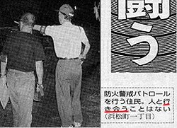 「桐生タイムス」平成13年(2001)7月19日版より.(画像編集、及び赤下線HP編集者) 不審火に対して防火警戒パトロールを住民が自発的に行っているとの新聞記事.良く見っと、写真の説明文に「人と行き会うことはない」とある. T先生の談では「ふつう、これってただ単に「会う」とか、「出会う」とか書くんじゃないかなぁ.群馬に来て、皆「会う」っていうのを「行き会う」って言うのになんか違和感あるんだけど、こういう説明文にも使うんだね」とおっしゃっていました.確かに群馬県人では気づかないかも・・・ いやいや、地元で使っている言葉を使って、ストレートに記事にする.これぞ「ローカル新聞の鑑」じゃねん!記者さんに「行き会ったら」激励しとくんべぇや! |