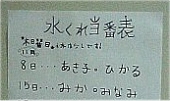 群馬じゃ「あげる、やる」には「くれる」を使うことが多く使われるんだぃね.(例:「花に水くれる」「赤ん坊におっぱいくれる」など)他の県の人には奇異に聞こえるそうだぃね. 左の画像、見てくんな.いずれも「水くれ」当番表. これは小学生の書いた紙だから、担任の先生も「水くれ」という言葉づかいに何の違和感もねんだんべね.これぞ方言の典型! NHK教育テレビの「趣味の園芸」を見てると「水やりに注意してください」等、必ず「水やり」さね.もちろん番組テキストも「水やり」.もし群馬テレビで園芸番組を制作したら、ぜひ「水くれにはおーか注意してくんない」くれーゆってほしいもんだぃね. |