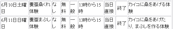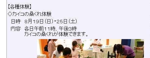 日本絹の里(高崎市)でも「桑くれ体験」があるんね(笑) HPをキャプチャして引用させてもらったよ. 群馬は「くれ」だね、やっぱ. |