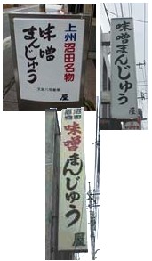 群馬名物といえば、「やきまんじゅう」.かの昭和天皇もご好物だったと伺ってるで. 平野部では「やきまんじゅう」なんだけんど、沼田では「みそまんじゅう」とゆわれているのをご存知?? 深紫@沼田さんから、近所の沼田市内の「みそまんじゅう」店の看板の画像を3箇所もいただいたので、一枚の画像に合成してみましたで.それが左だぃね. 沼田ではやはり「焼きまんじゅう」じゃねんだねぇ. 2002年11月30日のNHK教育「おかあさんといっしょ」で、伊勢崎市でのコンサートの模様を放送していたが、うたのおねえさん(当時)である「つのだりょうこ」さん(沼田出身)は、オープニングの華蔵寺公園ロケでは「いせさき」発音をNHK発音していたんだけんど、そこから地元名物「やきまんじゅう」店へ、「やきまんじゅうは甘くておいしいのよ〜」と全国に(群馬県共通語の「やきまんじゅう」で)紹介. コンサートは子供とその親の熱気に包まれエンディングへ!出演者から会場&茶の間への一言、沼田出身の「りょうこおねえさん」は自慢のキンキン声で「みそ…(躊躇) みそまんじゅう〜とってもおいしかったで〜〜す!!」と絶叫!確かに「いせさき」アクセントはNHKに従ったが、名物「みそまんじゅう」だけは躊躇しながらも沼田ネィティヴで押し切ったで!これぞ見習いたい郷土愛の姿(笑) 【追記】2004年秋、水上町の「水上町農業まつり」にいったんさね.売店がでてたけど、「焼きまんじゅう」ではなくて、「味噌饅頭」の掲示が出てたで.(右)早速購入して、携帯で撮影しました.もちろんアンなしだったで. |