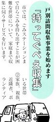 沼田市広報:平成15年4月号より 沼田市で、平成15年度から高齢者や寝たきり世帯で、ゴミを持ち出すことができない世帯には、家庭まで戸別訪問収集サービスを始めるんだそうだぃね. その名も「持ってぐべぇ収集」! 「べぇ」はさておき、「ってぐ」と、「ぐ」を使った表現が、なんとも粋だぃねぇ. というわけで、沼田市のこの粋な名称の行政サービス開始に敬意を表して、この講座でもこの「めっけたん?」のページに掲載して、永くその英断を称えたいんさね.(笑) でも沼田らしく、「もってぐっぺ」にしなかったのは、どうしてなん?? |
