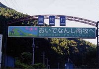 下仁田から上野村に抜ける「下仁田上野線」の南牧村境にある看板. 「おいでなんし」っつー、見慣れねぇ(聞きなれねぇ)方言看板! (東毛地区のお年寄りは「おいでなんしょ」という人はいるが、「おいでなんし」は聞かねぇなぁ) 西毛地区は未知の地域! 南牧村周辺の皆様の情報をお待ちしてらぃね! |