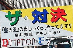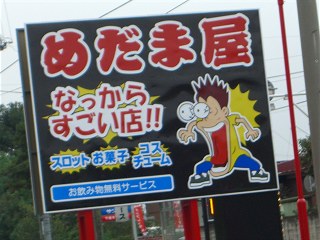 」 立派な群馬弁だんべね.「〜っくら」は渋川・吾妻方面で、「競争」の意味で使われています.「とびっくら」は「かけっこ(徒競争)」のことですね. パチンコ屋さんには、方言看板が多いですね.看板を作ってる方も楽しんでいるんだんべねぇ.(笑) いやーそれにしてもすげぇキャッチコピーだぃなぁ(笑) |
