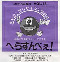 これも「べぇ」モノ. 前橋市リサイクル情報誌「へらすんべぇ!」、 前橋市役所生活環境部 清掃業務課発行 だそうだぃね. マスコットの愛称が「ラジアス」と横文字だぃね.意味はわかんねーや. せっかくだから「ヘラスン兵衛」とかじゃだめなんかねー? 得意技は「ヘズリィ光線」. 敵の名前も群馬県らしく、ぜひ「ブチャール星人」とか「フテール星人」とかにしてほしいな. |