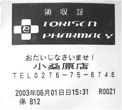 これも貴重な「おだいじなさい」モノ. 共通語だったら、「おだいじになさいませ」と「に」が入ぇるんさね! この「おだいじなさいませ」は、群馬の医療慣用句「おだいじなさい」の丁寧語のつもりに違げぇねぇよね! さすが地元「○りせんファーマシー」(本社館林市)! オレは「館林は文化的に群馬じゃねーよね」なんて「県庁おひねり講座寄席」で暴言を吐きました(反省)けんど、立派な群馬県文化の地だぃね!!お詫びして訂正すると同時に、群馬を愛する「○りせんグループ」さんに心より敬意を表すで! ぜひこのレシートは未来永劫続けてほしいもんだぃね 【追記】 ○りせんファーマシー、残念ながらなくなっちまったとのことだぃね・・・・. |