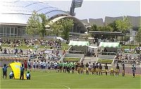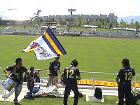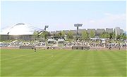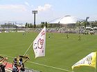 家族をプールに追いやり(失礼、丁重にお送りし)、いざ競技場入り。まぁ何もかも新しいんで、とにかく綺麗の一言。バックスタンドに酔一さん親子とマシマロさん夫妻を見つけ、なっからザスパ隊、めでたく合流完了。早速、酔一さんに駆けつけの冷えた一本(一本だけだよ)を頂き、のどを潤す。しっかし暑い。てか熱い。ここはさわやか信州だよな?カラッとしていて不快感はないけど、太陽が近くて遠赤外線ヒーターにジリジリ焼かれてる感じ。日焼け止め塗ってくりゃよかったぃ。(案の定、鼻筋は真っ赤で、サングラスでパンダな今です。。。)