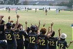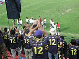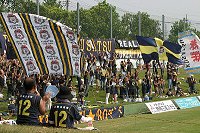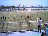 気持ちが高ぶってくるもんです。いよいよ試合開始。 静かな感じで立ち上がる。少々押し込まれぎみかも。 今日はどうだろうなあ、なんて考えてた矢先、コーナーから流れた球を加藤がシュートしてあっさり先制! 幸先イイ! その後はどうもこぼれ球を国士舘大側に拾われ、あまり攻め込めない状態が続く。 やはりトリさん欠場が痛いのか。 山崎が目立った動きができていない。 そんな中、2点目は27分、佐藤がやってくれました。ゴール正面で背中にDFを背負いながら、反転して見事なシュート!美技! これで2−0。やっぱ今日来てよかったなあ。前半危険な場面も2度ほどありましたが、決定的な1対1も御大小島の神がかりセーブで防ぎ、 そのまま前半終了。 気温は高いが(スタンド屋根下で35度って言ってた)天気は良いので、観客の入りもまずまず。 2,273人とのことでした。 後半に入り、ハーフタイムで指示を受けたのか、山崎が積極的に前に出るようになる。