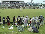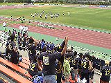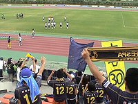 ところが1日に向け、迷走台風接近!3週間も雨が降らなかったのに、よりによってこんな時に降らなくても‥(泣)また雨中の対戦?それとも延期?ヒヤヒヤしながら迎えた当日の朝「お〜とりあえず雷は鳴っちょらん」お昼になって雨も上がり「ヨッシャー!東山へGO!」 徐々に気温が上がり、汗だくで東山に到着。さっそく「KUSATSU BOYS」やら「小島さんの笑顔」の垂れ幕が見えて来たー!いよいよ生ザスパが見れるのね〜っと、ねずみ男のチケット(SCホームチケット)を購入しいざ入場。居ました^^居ました^^アップ中のザスパの選手達。生小島さんに、生トリさん、生吉本‥‥。いきなりテンション上がりまくったけど、心配していた事が的中!!私のお気に入りの洋平が居らんがん(涙)SC江後と同じピッチに立っている姿を見るのが夢だったのに‥。でも生ザスパを目の前にして落ち込んでは居られないと、群馬から遥々800kmの旅をしてきて下さった、なっから従軍カメラマン・三束雨さん親子を探し出しご対面^^; ご挨拶もそこそこに三束雨さんは任務遂行!それじゃあ私も任務遂行!と思ったけど画像は三束雨さんの右に出る者はいないし特別する事なかったんだ^^;と、おとなしくキックオフを待っていると、サポの応援コールが始まり、その迫力にビックリ!30人程でこの迫力なら、ホームで何千人ともなるといったいどんだけの迫力なの?いきなりSCサポ喰ってしまってる^^; さて、いよいよキックオフ、前半やはりザスパが押し気味、30分頃佐藤とSC・GK清水とが激突両者倒れて中断。その後スコアレスの続く中41分SC・DF陣の守りが乱れオウンゴール!ザスパ1点先取!でもこんな点の取り方じゃザスパらしくないぞ〜っと思っていた前半終了1分前、SC岩田がFKを直接入れて(ごめんなさい、思わずヤッターっと叫んでました^^;)1−1で前半終了。 ハーフタイムでは7/31・8/1と米子「がいな祭」に参加した「やんちゃYOSAKOI」の子供達が可愛い踊りを披露してくれ、いざ後半へ
