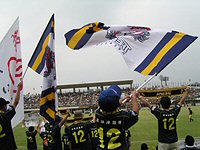 今度こそ、これで前半は終了かと思ったが、またしてもザスパは終了間際の悪夢に襲われてしまうのである。44分、ファウルによりセンターマークとゴールの中間付近からのFKを啓上し、安東がフェイクを入れた後、岩田が直接ゴールに突き刺し、同点とされてしまった。うーん、またこの時間か・・・。1−1で前半を折り返したが、後半はナムセーウンの置き土産、強風の風下のエンドである。果たして勝機はあるのか?といささか不安であった。ハーフタイムの可愛い「やんちゃYOSAKOI」を見た後、後半開始。案の定、ザスパの出すボールは殆ど風に押し戻されてしまう。グラウンダーでのパス回しを余儀なくされ、なかなかうまく繋がらない。両者とも追加点が奪えず膠着状態が続く。ところが頼りは彼である。そう彼しかいない。72分、SC、DFの一瞬のパスミスを、もはや神となった吉本が押し込み見事勝ち越し!(■)「どうだ、見たか!これがザスパだ!SC諸君!」である。終了直前には今日もスーパーファインセーブを繰り返したオヤジが相手FWとマジギレ小競り合いのオマケもついてそのまま2−1でホイッスル!!途中、何度も携帯を落としそうになったが、何とか得点後5分以内でのブログへの速報と、ひと通りビデオ撮影の任務を全うし、心地よい満足感で一杯であった。終了後のスタンドは改めて12番同士で、「お疲れ様でした〜」の声がいつも以上に掛けられていた。そして「気をつけて!」の声も。本当、来て良かったと心から思った。私が女の子だったらきっと泣いていただろう。米子特派員さんにはなっからの皆さんへと山陰名物「板わかめ」を手土産に頂戴し、別れを告げた。きっとまた会える日が来ますようにと。そして、来た時以上に胸を張って競技場を後にした。 | ||||