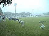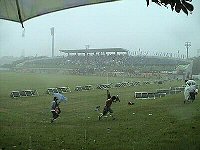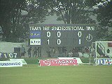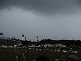 とはいえ、前半の状態を見る限りでは、なにも悲観する状況はありません。相手の速い展開にきちんと対応して攻めの形を作れば、ザスパゴール劇場も見られるってもんです。 前半30分頃から覆い始めた暗雲は、文字通り場内を夕方くらいの照度までおとし、加えて降雨・落雷を連れてきました。いらした方ご存じでしょうが、この球場には屋根ってもんがほとんどありません。照明装置に至っては、まるでありません。なもんで、控え室のあるメインスタンド1階の室内照明だけが、暗〜い場内の蛍の灯みたいで、ちょっと幻想的。