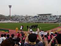12:10、選手がアップを開始。とりあえずご挨拶にと、我らも発声開始。♪胸ーを張ってー!前―に進―め!勝―利信じ!草津―戦えー!決して大応援団ではありませんが、皆が魂を込めて声を出し、また会場の音響効果もあって、我らがラスハルは勇壮に響き渡ります(私不覚にも、この時点ですでに感動しておりました)。今回の相手はJ1・セレッソ大阪。現在チームは不振に喘いでおりますが、それでもはっきり格上の強豪です。現日本代表のFW大久保選手、元代表の森島選手、西沢選手、そして我々には馴染み深いJFL・HONDAに所属していた古橋選手、ユース代表の苔口選手など、攻撃陣の顔ぶれは錚々たるものです。この強力FWの猛攻に対して、さて植木監督の取る手は如何に。先発メンバーはほぼいつも通りですが、先のJFL頂上決戦で負傷したボランチ大谷選手に代わり、強力なロングスローを持つ小久保選手が起用されております。圭志の分まで頼むで、純! 13:00、フェアプレーフラッグを先頭に選手入場です。ゴール裏とバックスタンドに分かれて陣取るセレッソサポーターの盛大なコールが場内に木霊します。こちらも負けてらんねいやぃね。いつものように草津節をあらん限りの声を振り絞って詠唱します。我らが魂よ、相手の歓声を押しのけて選手達に届け!主審の笛が鳴り響き、遂に夢舞台の幕が上がります。前半4分、最初の大ピンチ。ゴール前でセレッソ森島選手のヘディングが炸裂!これはバーを直撃して大事には至りませんでしたが、少しのスキも見逃さないのはさすがです。剣呑剣呑^^;)。その後前半20分くらいまでは、セレッソは右サイド酒本選手と左サイド苔口選手のサイドアタックを起点として攻勢をかけ、一方のザスパは自陣でボールを奪ってからの速攻カウンターを仕掛けますが、いずれも決め手を欠き決定機に至りません。試合の主導権がセレッソに傾きだしたのは、前半22分の森島選手のヘディングシュートから。23分、FW古橋選手、同DF下村選手のシュートが立て続けにゴールを襲いますが、辛くもこのピンチを凌ぎます。25分にはカウンターから右サイドMF依田選手がシュートを放ち、劣勢の中スパイスを効かせます。31分、古橋選手のミドルショットがゴール正面から放たれますが、GK小島選手のナイスセーブによってボールはゴールに収まりません。概ねセレッソの主導で推移した前半でしたが、前半残り5分間だけはプチ草津劇場です。前半40分、セレッソDFの不用意なクリアボールをゴール直前で佐藤選手がかっさらってシュート!これは相手GK伊藤選手が好セーブ。惜しい!続く43分、左タッチラインから小久保選手のレーザービームのようなロングスローに山口選手が合わせるがミートせず。44分、鳥居塚選手のシュートはわずかにゴールの右へ外れます。こうしてザスパの攻勢のうちに前半終了。ふ〜。スピード感のある攻めはさすがに強力なセレッソ。前半はその強力攻撃陣を徹底したマンマーク(特にもみちゃん!)で封殺したザスパ。この試合、第三者的に観戦してみても見応えあるんじゃねんきゃ。結構いけそぉげな雰囲気だいね♪油断無く、キッチリ守ってワンチャンスをモノにしてもらいたいもんです。さあ、後半! 後半は開始から10分くらいまでは、互いに中盤でのパスの奪い合いとなり、大きな展開がないまま膠着状態です。この停滞ムードの目を覚まさせるような強烈なシュートをFW西沢選手が放ちます。このシュートはまたしてもバーに当たってゴールインならず。後半63分、速攻から吉本選手のシュートまでこぎ着けますが、ゴールは割れず。状況を打開すべく、先に手を打ったのはセレッソでした。後半58分、西沢選手に替えて遂に大久保選手登場です。強力な切り札の登場はあまり歓迎できませんが、せっかく強豪チームと戦えるんですから、この際お互いに全開本気モードでやるんべぇや。大久保選手の投入は思いの外効果的で、沈滞したセレッソの攻撃にリズムが出てきたようです。なんて奴だ(苦笑)。そして後半66分、遂に均衡が破られました。再三にわたるピンチを好守で防いできたザスパですが、サイドの深い位置から上げられたセンタリングをクリアしきれず、ペナルティエリア内でボールを左右されると、FW森島選手の巧妙なシュートが決まり、ボールはGK小島選手の右脇をすり抜けてゴールマウスへと転がり込みました。さすがに技ありといったところです。しかしザスパもこのまま大人しくしているようなチームではありません。おそらくザスパの選手・関係者・サポーターの全てが同じことを脳裏に描いたに違いありません。『長野を思い出せ!』。ザスパが劣勢の中でコールリーダー氏が皆に語ります。「とにかく声を出そう。みんなの声は必ず選手に届く!」我々は「12」の背番号を戴いた12番目の仲間です。チームの一員として、ピッチには立てない代わりにスタンドから選手達にチカラとココロを送るのです!この先制ゴールで溜飲を下げ安心したか、セレッソの攻撃