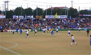 我らがザスパ草津、先週アウェー・七ヶ浜にてJFL後期後半戦に向かって幸先良い勝利を得たばかりと、ちょっこし波に乗る気配です。この試合は、JFL戦の良い流れを切らず、繋げる意味からも良い内容が求められるのではないかと思います。今年に限っては、昇格が懸かるJFLリーグ戦が最優先です。でもでも、痩せても涸れてもザスパサポーター。自軍が負けるところなんて1戦とて見たくはないものです。まぁ、怪我しないように、怪我をもらわないように用心して戦ってくんなぃ。 温泉マークの旗印の大旗を振るい、スタンドで勇名を馳せる、ねこさん。今回も気合い十分です。JFLホリコシ戦以来の「温泉刈り」ヘッドでスタンドの話題を独占状態。地元女子中学生が群がり、携帯メール撮影会の開催です(ご本人曰く、顔は撮さねんかい!)。また、どこの局か分からないですが、滅法接近して録画してました(笑)。ねこさんの捨て身のパフォーマンス(失礼!)に松任FCサポーターさん達も度肝を抜かれた感じでしたが、あちらさんも応援に熱が入ってましたよ。何ていうか、一体感があって、しかも下卑た感じがしない。いいなぁ、ああいう雰囲気。今日は敵味方として相対しますが、北信越リーグから上を目指して頑張って欲しいものです。そうそう、サポーターの話で忘れそうになりましたが、ここは越前、一向宗の国でもあります。一向宗といえば一向一揆。ありました。墨痕鮮やかな筵旗…ではなく、現代風の美しいブルーの幟旗に記された『進者往生極楽 退者無間地獄』の文字。こりゃ、インパクトあるわぁ!(こちらの「おやじ断幕」に負けてないやぃね)。 普段とは異なり、メインポールにJFAの旗がはためく中、選手がウォーミングアップのため登場。サポーターへの挨拶の後、アップ開始となります。皆頑張ってよ〜!。事前情報でキャプテン鳥居塚選手をはじめ、佐田選手、堺選手、高須選手らが欠場とのこと。加えて期待の新星マルキーニョスの登録申請が間に合わず、やはり欠場。なんとも不安材料てんこ盛りですなぁ…。腕を組み練習を見つめる植木監督、その胸中の秘策やいかに。さて選手入場。本日はアウェーのため白いユニフォームです。新ロゴ入りの紺のユニフォームは来週の長野までおあずけです。両チームサポーターの声援が交差する中、キックオフ!。序盤いきなり相手ゴール前に攻め込み、おっ、いきなり先制か?と思える上々の立ち上がりです。前半のザスパ、中盤を支配し、右サイド・依田,左サイド寺田両選手から供給されるパスを受け、中央トップ下に起用された岩本選手と山口選手が前線に放り込むという攻撃を見せます。前半25分頃までは何度か決定的なシーンを迎えるも、相手GKの好セーブもあって、なかなかゴールを割れません。優勢に立ちながら得点できない。幾度と無く見られ、そしてその都度良くない結果に至る轍です。前半22分には相手FKがゴール正面に弾道鋭く迫ります。この時は、草津の守護神・GK小島選手のナイスパンチングで事なきを得ましたが、こういう状況が何度か訪れた後の不意の失点が致命傷になることを、我々は知っています。だから自然と応援にも熱が入ります。 そうした想いが通じたか、前半29分、相手陣内に入った所でFKを得、小川選手が左サイド深くに走り込む山口選手へスルーパスを送ります。山口選手、これをすかさずゴール前へセンタリング。ゴール右からジャンプ一番吉本選手がヘディングシュートを放つ!が、これは惜しくも右ポストを直撃します。ところが跳ね返った球に猛然と突進する影、一つあり。このゲーム右サイドハーフに配された依田選手です。吉本選手の遙か後方からゴール前に突進した依田選手、ポストから返るボールを左足でミート!球は吉本選手のヘディングに対応し、そこまでとなっていたGKの背後に突き刺さりました。(■:約2.6M)この試合の流れを掴む一撃でした。前半はこの後、岩本選手のミドルシュートや山口選手のシュート,吉本選手のヘディング、はたまた相手カウンターからのループシュートやミドルショット(いずれも小島選手がナイスキャッチ)など多くの見せ場が訪れるものの、両チームとも得点には至りませんでした。先制点を取ることができて、ひと心地つきました。さあ、後半に期待です。期待といえば「あの選手」の登場機会ですが、さてどうなるでしょうね。間もなく後半開始です。 幕開きは突然でした。キックオフから間もない後半開始直後、センター付近のルーズボールを吉本選手が前線へフィード。この時高く上がるルーズボールの行方を注意深く見ていたのが佐藤選手です。佐藤選手、2人残った相手DFの中央を突破し、GKと1対1の状況を作り出すと、GKの位置を見極め、右足をコントロールしてシュート!この状況で外す選手ではありません。こうして待望の2点目(■:約1.4M)はあっけなくもたらされました。一度火が点くと止まらないのが我らがザスパ。さあ、ザスパ劇場の始まりですよ〜♪ 佐