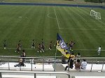 スタメンはホーム初戦ということもあってか?サテ初戦以来のチャレンジャーズチームのみの編成。GK棗、DF杉山、柳澤、富松、野口、MF高向、諸、後藤、豊原、FW 佐藤、樋口。中盤は高向と諸のダブルボランチ+右に後藤、左に豊原が張り出す形。控えはGK近藤、DF前節仙台戦でベガサポ(女子)にやたらと人気だった三上、MF佐田、小久保、FW御給。後者3名がこの日のトップ→サテ出張組ですな。再び霧が出てきて見えにくい状況のなかでのキックオフ。開始前の円陣がいつもより長く感じたが、一体何を話していたのだろうか? 前半は霧が出ているとはいっても自陣ならなんとか見えたし、ときおり霧がなくなったので試合の流れを追うことは可能だった。が、1週間前の同カードとほぼ同じスタメン(財前はいなかったが...)のベガルタ、やはり強敵は強敵のままであった。 ホームは我々だというのにどうも相手にペースを握られている感。 前半9分、さっそく悲劇はおこる。チェリーこと後藤が柳澤に渡そうとしてゆるいパスを出す。そこをすかさずインターセプトしてきたのが仙台13番の松浦。棗も前に出てきていたため、無人のゴールにそのままゴール→仙台の先制。自分が犯したミスに落ち込むチェリーの肩を叩くキャプテン宏太。なぁにまだ開始10分も経ってないんだから、まずは1点取り返そう!前向きにいこーぜ!と思いながら観ていたのだが、うーん...どうもなかなかエンジンがかからないんだな。満足に攻撃の形もあまり作れないし、なによりも守備が危ない。GKに戻そうとするラストパスがどうにも中途半端。