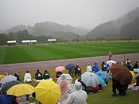 (これまたスゴイ!)。 試合前には限定300枚でチャレンジャーズチーム仕様のTシャツが販売。胸正面に「泉質主義」後ろに「草津温泉」が入っている、あのTシャツです♪買って即着て観戦する人大勢。私ももちろんその一人でした。シャツ購入後足首の上をブヨに刺されてしまい、選手たちも使用する医務室(とはいってもテント)で手当を受け、席に戻るときにフィールド脇を歩いていたら仙台の選手にジロジロ見られながらすれ違うというハプニングも有(苦笑)。この日の草津は長袖でないと辛い程涼しかったのですが、虫はいるんですね...。 涼しいだけならまだしも、試合開始を待っていると雨も降り出してくる始末。雨だけならカッパをきて凌ぐことができるが、追い打ちをかけるかのように霧も出現(泣)。選手がアップするときには薄かった霧も、試合開始直前になるとすぐ目の前にあるはずのタッチラインさえも見えにくい状況。