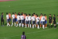 19分。試合勘の未だ戻りきらないボランチ大谷選手と3バックシステムに馴れ切れないDF陣の隙を突かれ、先制点を奪われます。相手右サイドからの攻撃に対し、マンマークに付いた野口選手がかわされ、さらにプレスを掛けに行った富松選手、飛び出した棗選手と次々に抜かれ、最後はそれでもゴールマウスまで駆け戻った富松選手(?)の足先もわずかに及ばず、ボールはゴールへと転がり込んでしまいました。痛い先制点、0対1。 その後も短い横パスや前線との連携が取れないセンタリングなど、スタンドのイライラが続く展開が続きます。もっとも3バックへのシステム変更に伴い、従来の右サイド後藤における杉山、左サイド豊原における野口という後方支援の機能が失われたのは致し方ないことだったのかもしれません。そのため両翼は波状攻撃を繰り出すべくもなく、ウイングの豊原・小林両選手が単騎孤立し潰されるというケースが多く見られました。やはり両SB野口・杉山両選手の駆け上がりは、相手守備陣に対して相当な心理的プレッシャーを与えていたことを今更ながら実感させられます。その他、棗キャプテンが「お前らもっとしゃべろーぜ」と声を掛けるほど、自信とビジョンを失ってしまったような状態で前半を終えます。