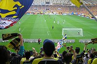 桜散り、時移ろい、あっと言う間に「コイ」の季節です。本日は、四角い緑のお盆に乗せられた「柏餅」を頂くべく、郷里群馬より東南に進路を取り、千葉県柏市へと侵攻です。柏市へのアクセスにはたくさんの手段がありますが、時間的融通よりも主に金銭的都合により、「なっからライターズ」相乗りにて一般道激走ツアー敢行です^^。GW期間も終盤となるこの時期ですから、高速道路はもとより、一般道といえども相当の交通量ではないかとの目算のもと、朝7時前の高崎発となりました。ルートは国道17号→国道125号→国道4号→国道16号→現地といった具合。時間帯が良かったのか、はたまた交通量自体が少なかったのか、当初の思惑に反して道程の全てが順調そのもので、気がつけば10時にはスタジアム前に着いてしまいました。とりあえず車を駐めて(スタジアムの近くに臨時駐車場;\1,000/日あり)ブランチを、と思ったのですが、開いてる店がありません(一般的な飲食店は早くても11:00開店だいね)。まあ、ここはお手軽に済ませてしまおうという事になり、某大手ハンバーガーチェーン店のお得なセットを皆で腹に詰め込みます。小腹も収まったところで、やおら出陣です。社宅と思しき住宅群の囲む中、ちょっとした公園の風情漂わす緑地こそが、本日の舞台である日立柏サッカー場です。元来、企業レクリエーション施設だったであろうことを色濃く示す造りのスポーツ施設群は、いやはや羨ましい限りの充実ぶりと言えましょう(昨今の大規模スタジアムとは別の良さがあらいね)。で、サッカー場はというと、これが聞きしに勝る箱庭スタジアム!初見で思い出したのがJFLの強豪・ホンダの本拠地である都田サッカー場。あれをJ規格に改装するとこうなるんだんべぇな、と思います。客席とピッチの距離が近いだけでなく、特にゴール裏などは傾斜も緩いことから、練習中および試合中にアウトボールが客席に飛び込むなんてことはざらですが、それも一つの魅力といえましょう。練習中のシュートボール(おそらくはマチャミ)が知人の持つカップビールを直撃したのは余談です^^;。 さてさて、本日アウェーに乗り込んでのお相手は、第1クールの初対戦においてこの上ない敗戦を喫した柏です。まあ、そんな古い話は今はそっと忘れて、黄色い渦中にネイビーブルーの楔を打ち込んでやろうではありませんか。前回対戦時との違いは結構ありますが、なんと言ってもDFリーダーに鳥居塚選手が今回は居ることが、今の草津にとっては(応援する我々にとっても)非常に大きなプラスの要素です。ここ数試合日程的に辛いものがありますが、スタメンは最近固定の顔ぶれです(怪我しねえように頑張ってくんない)。そのスタメンは次の面々。GK:1高木選手、DF:4齋藤選手・6鳥居塚選手・17尾本選手、MF(ボランチ):15中井選手・5チカ選手、MF:13山崎選手・10島田選手・7佐田選手、FW:9高田選手・24太田選手で構成される3-5-2のフォーメーションです。中盤の底(ボランチ)に中井選手とチカ選手を配しましたが、前節を見る限りでは「攻めのチカ・守りの中井」で攻守を組み立てるものと思われます。攻撃陣はこれまでと変更なく、太田選手がターゲットで、そのフォローを高田選手と左右のハーフたる佐田・山崎両選手が務めるといったところでしょう。ただ、前回対戦時のことを考慮して、右ないし左のハーフは少し下げ気味にして(3ボランチ気味にして)専守に回すことも考えられます。いずれにしても、我が方得点の鍵はターゲット・太田選手にどれだけ放り込むことができるか、そしてその競ったボールをどれだけ支配することができるかにかかっていると思います(しくじったときの速攻サイドアタックは危険を通り越してほぼ致命傷になりますから)。センターラインを折り線にして両ゴール裏に正対する両軍サポーター。各々の声援が直線的にぶつかり合う形ですが、いやはや柏サポの音量のでけぇこと。声出しサポの数だけなら大差ないと思うんですが、こちらの声援は向こう側ではいかが聞こえたのでしょうか。尤も、相手に聞かせるために詠っている訳ではないので、我がチームの選手諸君の背中を少しでも押せているのなら幸いです。選手入場前からヒートアップする場内に開始の合図が鳴り渡り、激戦の幕が上がります。 前半は開始から柏の攻勢が目立ちます。開始早々の前半8分、自陣ゴール前でFKを与えてしまいます。柏キッカーはゴール前に危険な浮き球を入れてきますが、守護神・GK高木選手の判断良いセービングで難を逃れます。これは今日も「神頼み」な展開なのかなぁと、ちっとんべぇ不安にもなります(神様は今日も調子良さげなんですがね)。草津陣営のプランとしては、やや上がり気味に位置取るチカ選手や中盤の島田選手に球を預けてから、左右のサイドに展開する佐田選手・山崎選手・高田選手らに配球、間髪を入れずにターゲットの太田選手へ球を当て、セットボールをシュートに持ち込む、といった連