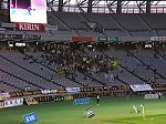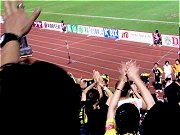 若干強めながらも爽やかな風がながれたこの日、厚別公園競技場でコンサドーレ札幌との一戦が行われました。もともと厚別は風の強いところ。陸上でも追い風参考記録が出やすいところだと聞いたことがあります。草津は斉藤竜の累積警告での欠場、控えには田中。高田、吉本のツートップ。対する札幌はフッキ、西谷、池内選手の欠場。これは我々ザスパ草津にとっては追い風。 北の大地厚別まで駆けつけた草津サポーターは20〜30人前後。眼前を真っ赤に染めたコンサドーレサポーターを見渡せばまさにここはAWAYであることを感じずにはいられません。しかし少数精鋭。心細さを感じることもあっても心が通じやすいっていう利点だった十分にあります。とにかく声を出し続けて選手に「俺たちがついてるぞ」ってしっかり伝えるつもりです。 前半開始。風上を取った札幌が攻め込みます。遠目から放つシュートも力があります。反面、前線に送る長いパスやクロスは風の影響もあってコントロールが難しそうな感も見受けられます。対する草津も前に蹴ったものが押し戻され風の影響を感じます。猛攻は走って体を張ってしのぎつつもカウンターを狙います。ともあれ、我々が応援している一番遠いところでゲームが動いている時間が長かったわけです。しかも最近「坊主頭」が多くなったおかげで選手の区別が難しくなったり。いずれにしても風が結構なカギを握っている雰囲気。スコアは0−0のまま終了となります。後半開始。決定的なチャンスも何度か潰しスコアに得点を刻めなかった札幌。それをしのぎ、今度は風上に立つことになった草津。ひょっとしたら流れが来るんじゃないのかと予感させます。すると残半開始早々ザスパ草津に「追い風」が吹きます。前半、札幌側がコントロールし切れなかった前への長いボールを蹴った中井。頭で合わせようと頑張る吉本も、そしてGKも届かず、そのままゴールに流れこんでGOOOOOAL!!!! 遠いところでおきたゴールに歓喜の声。しかし52分に鳥居塚が石井を倒してPKを献上、そのままゴールとなり1−1。 同点に追いつかれ、60分山崎から田中に交代、3バックに変更。71分には高田から太田、78分には寺田に替え依田を投入し、ゴールを狙うも得点を奪えず、時間は刻々と過ぎて行きます。もう終了が近づいた89分、田中のミスキックのような形からボールを奪われ、途中出場の中山元気が頭であわせ草津のゴールネットを揺らします。2−1、本当に手痛い1点を奪われました。だけどここで「追い風」を自ら呼び込んだのではと思われるひとつの場面がありました。依田がゴール前で寝転んでいた田中、尾本両選手の頬を叩いたり服を掴むような仕草で、まだ試合は終わっていないんだ!と二人を引き起こした場面がありました。正直、依田がこんな熱いハートを持っていたとは知らず驚きもしました。 それをきっかけに選手、また私たちサポーターも奮い立ち、ロスタイムに風に乗ったロングボールからのゴール前の混戦の中、島田が胸で落としたボールをチカが振りぬく!GOOOOOAL!!!! 土壇場で同点!2-2で終了!心にグッときました。 ゲーム終了後、サポーターたちが選手に掛けた言葉の中には「もうちょっとなんだ!俺たちと頑張っていこうぜ!」等、心から激励する声がたくさん聞こえました。それはテレビには映ることがなかった小さな変化を目の当たりにし、いずれこれらが大きな「草津への追い風」となることを感じ取ったからだと私は思っています。 【梅@西毛】 |
