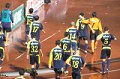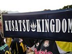 後半19分、愛媛陣内深くに侵攻し、重厚な陣容で相手DFを翻弄するような素早いパス回しを次々と繰り出します。そして右サイドを深く抉った鳥居塚選手、シュートも選択できるような状況でしたが、周囲を素早く一瞥、より確度の高い道を選択し、中央を爆走してきて完全にフリーになっている松下選手へとマイナスのパスを絶妙な位置にセットアップします。松下選手、走り込み、ボールが眼前に転がり来たときには全くの不惑、振り上げ振り抜いた右足からは低く鋭い弾道のミドルシュートが放たれ、光の矢のごとくGKの壁を貫きます。次の瞬間にはゴールネットが大きく揺れていました。GOOOOOAL!!! アウェイバックスタンドの興奮は今や絶頂♪ このまま終われない愛媛は、後半23分に交代出場のFW・ジョジマール選手がこぼれ球を押し込んで1点を返したことで、息を吹き返しかけます。これに対して草津ベンチは、守備の安定を期して、後半26分にMF・山崎選手→MF・秋葉選手の交代を行い、矢継ぎ早に後半31分、FW・高田選手→FW・松浦選手、後半37分、MF・カレカ選手→MF・里見選手と交代カードを使い切ります。僕らが思い描いていた通りの交代と時間です。2点差となったことで、この後の時間の使い方が非常に重要となりました。前半からイケイケだった選手達の疲労を考えると、残り時間はセーフティに専守防衛でOKです。ただし、がっつり引いてしまうと、これまでがそうであったように失点の危険性が増すばかりなので、危なくない範囲で前掛かりな態勢を取るのがベストでしょう。そして、ピッチ上ではその理想的な形を選手達が体現してくれています。中盤はボランチが引き締め、SBも上がりすぎず、引きすぎない位置をキープ、前線からのプレスはフレッシュな秋葉選手や里見選手が担当します。隙を見てボールを奪えば、松浦選手が走り出すという連携を見せるものですから、一刻も早く攻めに転じたいけれど守備に戻らなくちゃならない愛媛側の出足は鈍る一方です。時計の針は45分を経過、第4審判のかざすボードには「3」の電光文字。少し長いな。気を抜くな、あと少し、もう大丈夫。祈るような、ほとばしるような想いを胸に秘め、あるいは口に出してその時を待ちます。草津側にボールが収まったところで主審の手が上がり、タイムアップ。久しく忘れていた感動に、しばし声も出ません。うおっしゃぁ〜〜〜〜っぉらぁ〜〜!!! 吼えた吼えた(笑)。