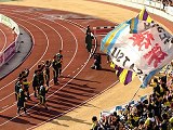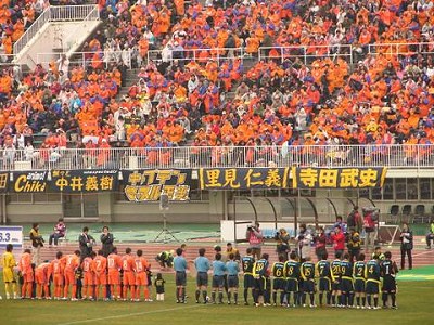 予報どおりのやっぱなぁの雨。でも大した降りじゃねぇし、だぃちっから、この時期「空っ風」よりゃマシだぁ。対アルビレックス新潟PSM。1月に前橋で行われた『THESPARTY!!』で『負けたら終わりの想いでJ2への途を戦ってきた』草津時代に言及した監督の覚悟。「ある程度実績を残した選手」を補強し、2年後の昇格に向けてスタートした3シーズン目のザスパ。選手もフロントもサポも、みんなぁ!準備OKかぃ?わっきゃぁねぇよ、アッという間だかんねぇ、1年・2年なんて。「SOLD OUT」の芝生席。アルビ側は本物、正真正銘の映える「オレンジ軍団」。ホーム側は「エーッ??」、やっぱ占拠されちまったアウェイの敷島。去年の熊谷みてぃ。でも冬を越し、漸く迎えた球春に響くコールと湯もみは健在。今年も1年頼んだよー!!スタンドの断幕はショボイ。やっぱ、あんだけ代えちゃうとなぁ。Newは『熱くなれ 山本拓弥』だけ。でも、ピッチUPの選手の中に、「当たり負けしそうも無い、やけに良い体格だなぁ」っつうのと、「タッチが柔らかくて、しなやかだなぁ」ってのが気になる。よーく見ると前者は佐野コーチ、変わったんは選手ばかりじゃねぇんだぃね。後者は「もしかして、あれが松浦?」程度の確認しかなんだけど、かなり期待して良いんじゃねえかな!それに、あーゆう「さりげなぁく」っていうプレー・タイプは大好きなんさね。 恒例のメンバー発表。アルビは、鹿島でも活躍した小っこいFW深井、オシムチルドレンの坂本隊長、福岡にいた長身の千代反田、中盤の鈴木や亜土夢選手等、オシムに呼ばれた矢野を除いてほぼベストメンバーを連れて来てくれた。続いて一際高らかな「我らが、ザスパ草津ゥー」で、やっぱ、もう間違っちゃたぁ。「背番号4−ン ディフェンダー 田中淳−ン」コールに、電光は「DF3」。たかが番号違いかもしれないが、7番中田、KINGカズは11番、一番上手いやつが付ける10番と言った俊輔etc。背番号はそうゆうもんで、選手は資産。誰が作るんだかしんねぇが、事前にシッカリチェックしてくれ、頼むから!!でも、こんだけ辞めた、入った、背番号変わる、ポジション変わった、おまけに、髪なんか伸ばされたりすりゃ、クイズしてるみてぃだからしょーがねっか。驚きは、秋葉選手のコールに大きな拍手を贈るアルビ・サポ。ありがとう!さすが、謙信の国?。こうゆうのに弱いんです、上州人は。それに秋葉選手が今ザスパにいる意味を、みんな知ってるかんね。 狂騒が戻ってきた敷島。入場の先頭はゲームキャプテンのチカ選手、いつもどおりの十字の仕種も今日は新鮮。ピッチ上の選手は、GKと松浦選手以外の9人は去年と同じなんに、おーか変わっちゃってるんさぁ。誰がどこ?なんて見てる間に、はぁ1点取られちまったってわけ。GK:新加入の本田選手(1番)、DF:右から佐田選手(髪を伸ばした)、田中選手(背番号4に)、チカ選手(最終ラインに)、寺田選手(背番号2に)。MF:下がり目の右が中井選手(背番号10に)、左は櫻田選手(髪も背番号も変わってないが・・・プレーは一番変身していた)、一列前に上がった鳥居塚選手が右に、左は山崎選手(背番号8に)。FW:新加入の松浦選手(背番号20)と高田選手の2トップ。GK:常澤選手(21番)、DF:山本選手(16番)、尾本選手(3番に)MF:桑原選手(15番)、秋葉選手(17番に)、FW:後藤選手とヘアスタイルがちっと変わった佐藤キャプテン。試合開始。あれぇ、はぁ1点取られちまったぃ。やっぱぁ今年も、外人に弱いんきゃ?早めの失点を心配しなきゃなんねぇんだんべか?でも、中盤が安定した落ち着いたサッカーで、攻守のいろんなパターンが引出しから出てきて、楽しましてくれるんじゃねぇか!?つう期待は持てそうだぃね。 それにしてもアルビの深井選手、シュート撃つんが楽しくってしょうがないっつう感じで、ファーストタッチのボールコントロール・反転からシュートへの切り返しの速さ・マークを置き去りにしていくスピードなど、やっぱなぁ。でも、惜しくもポストを直撃した高田選手のオーバーヘッドや、後藤選手などのFW、そこに繋がる攻撃パターンを繰り出し、押し上げていくMFやDF。流れの中の得点がいっぺい増えそうで、まぁーず楽しみ。そして42分。チカ選手のクロスに前で競ったこぼれ球が、ゴール前の松浦選手に。多分この日最初で最後のこれ1回ぽっきりのボールタッチをGOOOOOAL!!!! FINE GOAL!、ピッチアップの時みたいに、ゴールネットにパスするような基本どおりの決めたこともだけど、「あそこにいる必要」があるんだぃね、FWは。 以後のゲームは、やっぱ今年もどうやら敷島にお在します神の手ほか万の神々や内弁慶のアルビに助けられ、幾多の危ない場面もなんとか無失点で凌ぎきった。でも、そんだけ、ザスパの最終ラインに課題が・・・ってことなぁ!今年のザスパ・ゴールは「狭き門」にしてくれ!なんなら、閉じっぱなしだったって誰もちっとも困んねぇ。大盤振る舞いは、さんざやったから、たくさんだぁ!!その分相手ゴールには遠慮なく、入