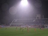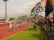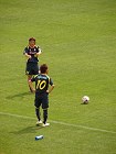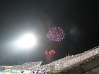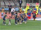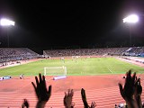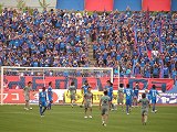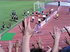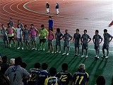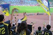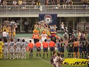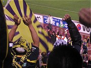 久しぶりの先発になる北に今日は奮戦してもらうんべぇや!と、盛んに北に声援が送られてたぃね。ザスパのスタメンは、GK北、DF崔、ペ・スンジン、田中、寺田、MF喜多、松下、熊林、島田、FW高田、後藤。GKに北が入った以外は最近不動のメンバー。サブに常澤(→メンバー紹介で間違えて読まれちゃってた)、尾本、秋葉、鳥居塚、山崎。元横浜のヤス・崔・スンジンも古巣との対戦で期するところがあるだんべぇから活躍を期待してぇとこだぃね。横浜はキング・カズが先発。あの元日本代表の三浦アツもいる。好調の元水戸のFWアンデルソンにも注意してぇとこだぃね。この一戦を裁く主審は・・・なんとJ2でリハビリ中のあのI本氏との発表。カードが乱舞(→選手次々に退場)しちまうんか・・・と一抹の不安がよぎる。照明塔に灯が入り、空席が目立っていた座席も試合開始が近づくと、メインもバックも徐々に埋まり始める。横浜FCのサポは向こう側の同じ2階席に陣取っているんだけんど、オレたちの方が数多いんじゃねぇん?草津節が薄暮の日産スタジアムに響きわたり、キックオフ! 試合開始。横浜は開始早々ザスパ陣内でFKのチャンスを得る。キッカーは、あの三浦アツ。これは幸いにも決まらず。8分には左サイド上がった三浦アツが、シュート。枠に飛んでいたが北が良く反応し右手一本で弾き出したぃね!お見事!