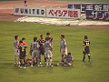 横浜は島田がボールを持つと、複数人で取り囲み徹底マーク。全体的に引き気味で、ザスパがボールを持って切り込むと、おーか激しくプレスをかけ、パスミスを誘い(芝も長めなんだか、パスも巧くまわんなかったぃね)、ボールを奪うと一気呵成にカウンターで攻め込めこんでくるんさ。今日の横浜は、堅守&カウンターの作戦の模様。ザスパも横浜の攻撃をCB2人と、前半引き気味だった松下がよく凌いでいたぃね。前半終了間際には、カズのトリッキーなドリブル披露で大いに場内が沸いたぃね(笑)さすがプロフェッショナル!0−0で前半終了。ザスパの放ったシュートはヤスのあの1本っきししかなかったぃね。 ハーフタイム、鳥栖がC大阪を破ったことがスクリーンに映し出された。「おおっ!これで勝てば・・・3位になれる!」ゴール裏は色めきたったんだけんど・・・。