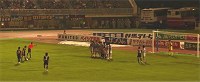 15分、20分と時間が経過してゆきますが、互いにビッグプレイを招き入れることが出来ずに藻掻いている様な状態が続きます。はっきりと押されまくっているわけではありませんが、そこはかとなく相手のペースで試合は運んでいるといった感じです。相手に合わせた戦い方をしてしまっている、とも言えるでしょう。このような状況が長く続くと、いつシーソーが大きく熊本側へ傾くか知れたものではありません。何か一つアクセントを付けて、良くない流れに楔を打ち込んでおきたいところです。そんな中訪れた後半25分、自陣深い位置での相手ファールによって得たFKの場面です。キッカーはGK・本田選手。右サイドへ大きく蹴り出されたハイボールを高田選手と熊本DF・矢野選手が競り合い、ボールはこぼれて熊本側フィールドのほぼ中央へ転がります。ここに駆け寄ったのが熊本・吉井選手と草津・山崎選手。しかし先に右足をノートラップで振り抜いたのは、我らがNo.8・会長ワタル君です。放たれた矢は細かい雨のベールを切り裂くように加速し30m以上の距離を飛空、誰に触れられることなく白いネットに突き刺さりました。GOOOOOAL!!! MARVELOUS! この得点はまさにその楔となりました。ワンチャンスを活かした、しかも度肝を抜くようなスーパーシュートによって、草津は再び息を吹き返すことが出来ました。俄然ヒートアップする場内。ただ両軍とも選手達の疲労は明らかで、30分、40分と進むにつれて放り込みサッカーの様相を深めてゆきます。ある選手などはプレイが切れるたびに腰に手を当てるなど電池切れ寸前(^^;)。怪我だけはすんなよ〜。そんな心配ばかり的中します。後半42分、相手選手と接触した後に倒れたままとなっていた高田選手がストレッチャーで場外へ運び出され、そのまま交代(→IN