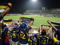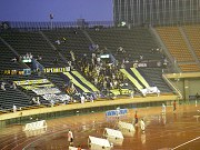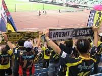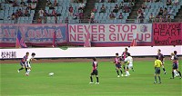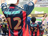 今日のザスパは、前節出場停止だった熊林、ケガが癒えて復帰の廣山がそろって中盤の前線に復帰、2試合出場停止中の藤井に代わってセンターバックに喜多、FWは都倉、高田のツートップ。如何に島田に封じ込めて長らく続くホーム戦未勝利に終止符を打つかが焦点だぃね。メインでは少年サッカーの子供たちが多く陣取ってにぎやかだぃね。バクスタには前身のリエゾン草津時代を彷彿とさせるような、紺と赤のストライプ限定のユニを纏ったサポータもまっさか多いじゃねぇきゃ。近くで見せてもらったけんどなっからカッコいんだねぇ。今度はホームのユニも紺と黄の縦縞でもいんじゃねんかね?選手紹介。鳥栖・島田のところで、場内割れんばかりの史上最大のブーイング!アイツの力量を骨の髄まで知っているオレ達だからこその、愛たっぷりのブーイングだぃね。ザスパを去ってったアイツに、ここで一泡吹かしてやって、鳥栖に移籍したことを後悔さしてやるんべぇや(笑) 選手入場。見慣れぬ紺と赤のユニだと、なんだか全く違がぁチームに声援を送るような気分だぃねぇ。そういや朝からの雨もすっかり止んじまった。草津温泉を模した沸騰の赤いユニで一暴れしてもらうんべぇ!試合開始、左サイドの島田がボールを持つたんびにブーイングが起こる起こる(笑)それにしてもハーフナーはでっけぇな。櫻田なんか肩までしかねぇんじゃねぇか。島田からハーフナーにあわされたらうまかねぇやぃな・・・と思ってたら、ゴールキックをカットされ、右サイドにいたハーフナーにボールが渡り、オレたちのバクスタ前のペナルティエリア角あたりからハーフナーがふわっとしたシュート・・・が、これがゴールに吸い込まれ、あっけなくいきなりの失点、0-1。開始わずか4分。島田を封じてぐどころか、いきなりのビハインドになっちまった。 その後も鳥栖の攻勢が続く。コーナーキックやフリーキックで島田がキッカーとなるときは、幾重にも重なる愛あるブーイング!この日の主審も、完全な?オフサイドを流した副審もちょっとアレだったもんで、選手もサポもフラストレーションがまっさか募ったぃね。佐野監督も前に出ておーか熱くなってらぁ。前半唯一のチャンスは佐田の右サイドの突破から、折り返したところを都倉がヘッドするも大きく枠を外れ得点ならず。その後廣山に黄紙が提示され、そして前半終了近くに都倉が黄紙を提示されると、それに激昂した佐野監督の審判へ抗議が執拗とされ、なんと退席処分。後半は指揮官を欠くことなったぃね。 後半開始早々、左サイドから熊林のクロスに、都倉が頭で合わせたんだけんど、これが無情に右ポストを叩いて得点ならず。ここで同点になってれば流れは大きく変わってたんだんべけんど・・・逆にその数分後、鳥栖はCKのチャンスを得て、キッカーは島田。左足から放たれたボールは飯尾の頭にピンポイントであわされゴールを決められちまった。注意すべきはやっぱ島田だった。敵にすると恐ろしいヤツだぃねぇ。これで0-2。こないだの栃木戦よりはシュートの意識はあるもんの、相変わらずゴール前で攻めあぐむ。しかし2点取られてやっと目が覚めたんだか(遅い!)徐々に攻勢になってはきたが・・・後半21分には惜っしいシュートを放った高田から後藤に交代。後半25分、そんな中熊林のパスを受けた松下が遠目から右足を豪快に振りぬくと、ボールは弾丸のごとく地を這いゴールに突き刺さった!GOOOOOAL!!! すんげぇスーパーなミドルシュート!まっさかお見事!ゴール前で変にこねくり回すより、こういった豪快なシュートをがんがん打ってほしいんだよねー。オレ達がスタンドで喜びまくっていたころ、島田は交代を告げられ、ピッチから去っていたんさね。(オレはアナウンスがあって初めて気付いたんさね(笑))島田がひっこんでくれた安堵と、まっと島田のプレーを見ていたかったとゆう実に複雑な気分。マークをしていた島田がいなくなったからなんだか、こっからはザスパの時間帯だった。後半29分には廣山に代えて小池を投入。鳥栖はハーフナーすら自陣に戻り、11人でザスパの攻勢を凌いでたで。後半37分には櫻田に代え佐藤穣を投入。ザスパは攻めるっきゃねぇ。一気に前がかり。度重なるザスパのフリーキックやコーナーキックのチャンスに同点あるいは逆転の期待が膨らんだんだけんど、あと一歩の決定力なくゴールを割ることがでぎなかったぃね。ロスタイムは5分。流れから少なくとも同点の期待はあったけんど・・残り1分とゆうところで鳥栖の廣瀬にディフェンスラインの裏を取られ、決定的な3点目を奪われ万事休す。これで一気にメインスタンドの客が帰り始めちまった。そのまんま1-3で敗戦。 止んでいた雨が、試合終了と同時に降り始めたで。選手が挨拶に来て、コールリーダーの呼びかけでブーイングをせずチームコールをしたんだけんど、落胆と失望に包まれたせいか、その声はまばら。今日は審判も敵?のような不運もあったけ