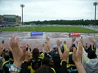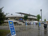 6月ともなると入梅、さすがに雨のシーズンがやって来ていますが、サッカー観戦の日に限って雨に降られてしまうのは如何なものかと思う今日この頃です。今日の対戦相手・水戸戦に向かうため、渋川ICより関越道から北関東道へ進み一度国道50号に下りて(あと何年かで繋がると、もっと近場になります!)再度佐野ICから入って北関東道へ、目指すはひたちなか市陸上競技場。周りには公園や球技場など隣接されていましたが、何せこの雨では人の出足も悪いのかちょっと閑散(^^; )片や試合開始に向けて順調にアウェイゴール裏の芝生席に我らがザスパサポーターが集結して来ています。ゴール裏の緩い傾斜の芝生ゾーンって、こんなに試合が見づらかったっけ?みたいな感想を全員が思っているに違いありません。草津のホーム敷島も昔バクスタ工事中の時はゴール裏はそんなものだったですよね^^;(今の正田スタに来るアウェイサポも同じことを思ってるのでしょうね。) コールリーダーからは「今日のキーマンは何と言ってもFW高田選手とDFチェ・ソンヨン選手なんだ!」と、最近得点から遠ざかっている高田選手とケガから復帰してきたソンヨン選手には、どうしても草津サポの思いや願いを届かせたい!!ということで、ピッチコンディションを確認している時から二人のコールをこの競技場に響かせました。赤のシューズが光る高田選手とオレンジのシューズが輝くソンヨン選手の意気込みが感じられ、走りやシュート捌きに期待は膨らみます。 北関東ダービー第3戦目としては、前みたいに何か催し物があるのか?と思いましたが、草津の湯友くんも水戸のホーリーくんも戦う様子もなく、フラッグを持っての参戦となりました。試合は、午後3時4分キックオフとなりました。今日のスタメンは、GK22北選手 DF5チェ・ソンヨン選手 26藤井選手 4田中選手 2寺田選手 MF10廣山選手 30松下選手 6櫻田選手 14熊林選手 FW9高田選手 19後藤選手の布陣で挑みます。またリザーブでは、GK21常澤選手 DF15喜多選手 MF8山崎選手 MF13佐藤選手 FW18小池選手が控えます。想像以上にピッチコンディションは悪く、雨の影響で所々で球は止まってしまい、なかなかパスが通りません。コンパクトに球を繋いでの作戦も思うように行かず、ピッチの状況を判断している矢先に、相手FWからのミドルループシュートがゴール前の芝が剥げていたのも影響してか?前目に出ていた草津のGK北選手のジャンプの上をかすめ、そのままゴールに入ってしまい前半6分に先制点を献上。あっけない形で先制点を許してしまい、なかなか攻守の切り替えが出来なくなってしまっている我ら草津。1点目をリセットできたのかどうかよく判らないまま、難しいピッチでの試合は進んでいきました。相手の水戸は、サブホームと言うこともありか?それとも、確実にロングボールから高さを活かしての中へポストプレーヤーを目掛けて放り込みという戦術が雨の影響をあまり受けていないのか、単調ではありますが、カウンター狙いが精度を上げ始めて来ていました。そんな中、前半25分には、右サイドに振られた球をセンターに切り返されド・フリーにさせてしまっていた所にソンヨン選手が気付き滑り込んで足を出しましたが届かず、相手のFWにシュートを決められ悔しい2点目を献上されてしまいました。抜かれたソンヨン選手はみんなを叱咤し、ピッチコンディションは悪くても自分たちのサッカーを貫いてこそ草津の選手、お互いを信じてプレーをしていこうという姿勢が私たちサポーターにまで届くことができました。その後は、他の選手たちも水たまりのピッチにも慣れてきた様子で、松下選手や櫻田選手を介してのサイドパスから裏を抜けた後藤選手や高田選手の所まで前線へ球が通るようになり、前半42分に左サイドに通った球をFW高田選手が折り返し、一瞬MF熊林選手にDFが攣られた所をスルーして、ド・フリーになったFW後藤選手が相手ゴールにシュートを叩き込みGOOOOOAL!!! このゴールは、J2になってチーム200ゴール目の達成ゴールであり、これからも続く通過点でもありますが、まだまだどんどんゴールを決めてもらいたいものです。そんな中、前半が終了し後半へと進んでいきました。 後半開始早々、ソンヨン選手の足に異変が起こり、52分にFW登録の小池選手と交代。小池選手はSBも起用にこなせるフィジカルの高い選手でもあり、足のスピードにも定評があっていつでも駆け上がれてシュートまで持っていける選手な訳で、運動量の多い小池選手を早い時間から活かして切り替えができれば、試合の流れを変えることも当然可能な訳です。徐々にではありますが、試合の流れが草津になって来たのもつかの間、松下選手のCKから相手のゴール前で廣山選手と後藤選手が交錯してしまい、お互いの眉間の上を強打し、後藤選手は脳震盪を起こし意識がはっきりするまでピッチの外でしばらく様子を見ることになってしまいました。また廣山選手は眉間の上を切った様子で、なか