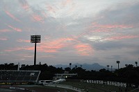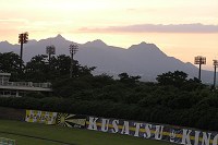 かなり早めに敷島へやって来ました。天気も良いし、利根川を渡る風も心地好いので、河川敷から公園までお散歩に出かけます。人間、時間があると色々考えます。不思議なもので、真っ先に思い浮かべるのは「良くないこと」。あれは拙かった、こうすべきだった等々、反省会からスタートです。今日は試合なので、自然、草津の事を考えていました。で、勿論反省会開始です(笑)。車で移動している時はすぐに目的地に着いてしまうので、大抵は「反省会」で思考終了となってしまって、ネガったままスタジアム入りなんてことも良くありますが、こうしたお散歩で得るゆったりとした移動速度とたくさんの時間は、その「反省会」の先に「でもこんな良いこともあったよね」を思い出すゆとりを与えてくれます。そうしてみると、「なぁんだ、決して悲壮感漂うばっかりじゃあないじゃん、俺達」みたいな結論に至り、結構優しい気持ちを持ってスタジアムへ向かうことが出来ましたよ。お散歩、大事です^^。入場ゲートをくぐると、おお、今日もくれるのか牛乳。そう言えば今日の試合の冠だったいなぁ。好きだと言ったら周りじゅうからいっぺぇ頂いちゃったで^^。ではでは、今日も牛乳ちゅるちゅる吸いながらスタメン確認。GK:22・北選手、DF:2・寺田選手、4・田中選手、15・喜多選手、7・佐田選手、DMF:6・櫻田選手、30・松下選手、OMF: 14・熊林選手、10・廣山選手、FW:19・後藤選手、9・高田選手、リザーブメンバー・GK:21・常澤選手、DF:17・秋葉選手、MF:8・山崎選手、25・佐藤(穣)選手、FW:18・小池選手。秋葉選手、久々のベンチ入りです。DFのサブは出場機会が限られてしまうので、今日の登場は微妙ですが、ピッチで練習する姿を見られて嬉しいですね。ところで、田中選手に続いて櫻田選手がJ100試合出場達成です。草津のポゼッションサッカーを底支えする重要なポジションを長いこと担ってきた経験は小さくありません。サクちゃんの出来が草津の戦績に直結すると言っても良いような立場なんです。大きな期待に応えてくんなぃ。本日の対戦相手である熊本は、草津と同じスタイルを掲げています。中盤での細かいパスの応酬の末に、ゴールへ、勝利への花道をこじ開けるのはどちらか。そんな白熱した展開が期待されます。もっとも、互いに同じミスや消極的なところを見せ出すと、途端に凡戦に成り下がるので、ここは是非とも積極果敢なアタックを望みます(特に草津)。 平日のナイターにも関わらず草津バックスタンドの住人達はいつも通りに「出勤」し、意気旺盛です。朱く染まる榛名山を遠景に、スタジアムを覆う夕闇震わす大音量の草津節。頼む!試合後にもう一度草津節を詠わせてくれ!切なる想いを乗せてセンターサークルからボールが蹴り出されます。草津GO! 試合開始からペースを掴んだのは草津。最初のダイジェストは前半8分、ハーフエリアからのFKの場面。相手GKが前目に位置取っているのを見て取った松下選手がロングシュートを狙います。入りはしませんが、こうした試みはGOODです。続く9分、左サイドを後藤選手がドリブルで深く持ち上がり、中央の高田選手へショートパス。高田選手はDFに囲まれながらもこれを突破、シュートまで持ってゆきます。残念ながらキックがミートせず、GKに捕られてしまいました。しかしながら、草津らしい組み立からシュートまでの形を綺麗に表現していて、実に結構。どんどんゆきます。次は前半12分。左CKからの流れで一度はクリアされるものの、こぼれ球を拾った櫻田選手が間髪を入れずにミドルシュートを蹴り込みます。CK直後の混み合ったゴール前なので、上手く抜ければGKも弾道の見定めが難しい状況です。シュートボールはまんまとDFの壁をすり抜け、ゴール目がけて一直線。やはりGKはキャッチできずに懸命のパンチングが精一杯です。しかし、弾き出すあたり敵ながら天晴れ。こういう抜け目ない攻撃が良い流れと決定機を生み出すんです。いよいよ攻勢が本格化してきましたよ。前半14分、GK・北選手のゴールキックからリスタートの場面。長いボールは熊本エリア中央付近まで到達し、ここに居た高田選手がヘッドで前方へフィードします。高田選手の動きに呼応して後藤選手が反応、フィードボールを足元に収めると進撃開始です。DFをかわしてペナルティエリアに侵入、さあゴールは目前。しかしながら、させるものかと熊本DFが必死に体を入れてシュートコースを消したため、シュートはGKに防がれてしまいました。あとちっとんべぇで得点出来そうなんだがなぁ。そうした流れと雰囲気のまま前半も残すところあと5分となっています。この機を失いたくはないなあ。その気持ちを汲んでくれたかのような前半40分です。GK・北選手から始まるカウンターでした。右サイド自陣深くで北選手のスローパスを受け取ったSB・佐田選手は、疾風のごとき快足でサイドラインを縦一閃、ドリブルでガンガン持ち上がります。ハーフラインを越えた所で