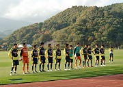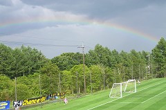 年に一度の草津でのサテライト戦。かつて、ザスパ草津がJリーグ昇格に向け数々の死闘を繰り広げてきた聖地・本白根第3グラウンドにて、J1の強豪・アルビレックス新潟を迎え入れます。草津開催のときは、常にアットホームなお祭りムードが満載!!観光ブースでは足湯ならぬ「手湯」を体験して手をサラサラにした上、特製タオルをゲット♪別のブースでは、応援メッセージを書くだけでU-23選手写真&勤務先紹介入りポスターとフラッグをゲット♪♪このように試合前の楽しいひとときを過ごせるのは、草津開催ならでは。 今日のチームを率いるのは木村U-23コーチですが、草津開催とだけあって植木GMも佐野監督もスタンドから見つめる今日の試合。GK伊藤選手を除き、オールU-23の選手たちで臨みます。スタメンはGK伊藤/DF冨田(CP)・有薗・高櫻・星野/MF宮下・市川・古矢・清水/FW森川・杉本の各選手。前節退場処分になった成田選手の代わりに高櫻選手、負傷中の藤崎選手に代わり森川選手が入ります。控えはGK寺田/MF飯山・武藤・成瀬・田村。今日は事情があって出られない選手を除いたU-23全員がベンチ入り♪U-23の結束力を 雲が厚く覆う空の下、毎年恒例・中澤町長のザスパ愛溢れた挨拶ののち、試合が始まります。前半。ザスパは苦しい立ち上がりにもかかわらず、早い時間に流れの中から先制点を奪いました。左ボランチの古矢選手から1人経てボールは森川選手へ。すかさず打ったシュートは一度クリアされてしまいましたが、双方多数入り乱れた混戦のなか、森川選手が再び押し込みます。このシュートをGKがはじき返したものの相手DFが入れてしまいGOOOOOAL!!! 開始5分、オウンゴールにて1-0とリードします。1点を取られた新潟はもちろん反撃を開始、ザスパは守る時間が増えます。が、今日のザスパU-23は守りながらも、チャンスがあればサイドからの攻撃を展開します。唯一のトップチーム登録・GK伊藤選手は終始大きな声でコーチング。それに他の選手たちとの連携もスムーズだし、ロングフィードが正確(今のザスパGKのなかで一番巧いのでは??)なので見ていて安心です。右SBのキャプテン・冨田選手は、各選手に細かく指示を出しながらラインコントロール。そのためCBの有薗・高櫻両選手も安心して守りに専念します。サイドバックからの上がりは裏を取られるのを恐れてか?いつもより控えめ。その代わり、今日はボランチを起点とする攻撃を多用しています。試合経験を積むごとに、選手たちが確実に成長しているのを感じ取れます。「守るべきところは守り、攻めるべきところは攻める」これがしっかりできるのは、お互いに信頼した上での意思疎通がはかれているからだと思うのです。2年目の選手が多いのも一因ですが、今シーズンは例年よりも選手の成長が早いように思えます。 前半から両チームとも全力でピッチを駆け回ります。果たして後半大丈夫なのか?という不安が出るくらい、共に全力です。新潟もザスパのアマチュア選手を相手に全力で戦ってくれるのは本当にありがたく、嬉しく思います。前半終了間際、新潟に集中的にシュートを浴びるものの、新潟の決定力欠如とザスパの踏ん張りで無事1-0のままハーフタイムへ。と、そのとき突然の大雨。しかし、一部のサポーターからは「霧で何も見えないわけじゃないんだから全然マシ」との声。というのも、2005年6月、同会場でのサテライト『霧の仙台戦』を体験しているサポーターにとっては、あの試合より視界が良ければ万事OKなのです(笑)。 横殴りの雨が降りしきるなか、後半開始。GKは伊藤選手に代わり寺田選手。ここからはU-23所属選手のみの戦いになります。雨は徐々に小降りになり、後半10分すぎには再び太陽がピッチを照らし出します。そしてなんとスタンド前方左には虹が!!!「これはU-23の勝利を予告する虹だ」とポジティブに思ってみましたが、勝負の神様は簡単に「勝ち点3」を与えてくれません。後半、数々の試練がU-23を襲います。清水選手に代わり飯山選手が入り、古矢選手を1列前に上げ、飯山選手・市川選手のダブルボランチにして間もない後半17分。市川選手が2枚目の黄紙で退場処分を下されます。次回=サテ最終戦には出られなくなったという事実を誰よりも重く受け止めたであろう市川選手、悔しそうな表情でピッチを去ります。ザスパは4-4-1のフォーメーションに変更、森川選手の1トップ、杉本選手を1列下げ、市川選手の位置に再び古矢選手が入ります。失点阻止を最優先した、10人仕様の布陣です。とはいっても早い時間に追加点がほしい、どうしても勝ちたい! …ここにいる皆の思いがひとつになったのでしょう。後半23分、ペナルティエリアのほんのわずか外、キーパー真っ正面という絶好の位置で直接FKのチャンスを得ます。蹴るのは杉本選手。グラウンドが一瞬静まりかえります。すると…なんと!直接ゴールネットに吸い込まれGOOOOOAL!!! 劣勢のザスパが追加点を決め、2対0となります。サポーターが陣取る目の前