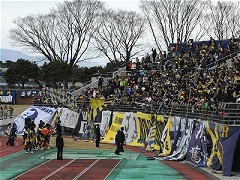 早春の3月。敷島の杜が目覚める春です。待望のザスパ草津、2010シーズンのホーム開幕戦です。正田スタジアム・メイン側は、広場と言うよりは通路のような形態となっているので、ずらりと並んだ物販屋台はさながら縁日の様相で、いつ行っても活気に溢れていて実に楽しく、ワクワクします。この屋台村はJリーグでも屈指ではないかと密かに思ってます^^。さてさて、いよいよここホーム正田スタで披露される2010年式ザスパ草津です。そのスターティングメンバーは前節と同じで、次の通りとなりました。GK:1・常澤聡選手、DF:16・佐藤将也選手、2・戸田和幸選手、20・柴田慎吾選手、7・佐田聡太郎選手、DMF:6・櫻田和樹選手、30・松下裕樹選手、OMF:10・廣山望選手、14・熊林親吾選手、FW:9・高田保則選手、19・後藤涼選手、リザーブメンバー・GK:22・北一真選手、DF:18・御厨貴文選手、24・梅井大輝選手、MF:23・菊池大介選手、25・山田晃平選手、FW:8・ラフィーニャ選手、27・杉本裕之選手。前年と同じ中盤〜前線に一新されたDFラインという構成で臨む4-4-2/2トップ2ボランチシステムです。注目は、まず守備陣では身長180pオーバーの大型DF・柴田、御厨、梅井の3選手。昨年の失点が身長差によるものだけとは思いませんが、相手にとって脅威となる武器は一つでも多く持っていたいので、この大きな防護壁は貴重です。攻撃陣で注目すべきはベンチ発進となりましたが、ラフィーニャ選手と菊池選手です。この2選手にはどれだけのものが秘められているのか、ワクワクが止まりませんぞ。あと、苦難の末にトップチームに復活した杉本選手には、温泉街メンバーとしての自負と誇りを胸に活躍してくれることを期待しています。ガンバレ・スギモン! 試合前にはバックスタンド前に副島監督がいらっしゃって、サポーターに挨拶をして下さいました。そのキリッとした容姿と相まって、実にジェントルな方だなあという印象を多くの人が持ったと思います。小さいことだけど、こういうのは大事だし、大切にしたいよね。あとはその采配で更なる信頼を得られれば、と思います。 風が榛名方向(西)から強く吹き下ろします。花粉にやられて鼻はズビズバ〜だし、目なんかね、もう開けてられません(T_T)。それでも目ぇ瞑ってる間に「何か」が起きちまっちゃあいけねぇんで、必死に目かっぴらいて試合を観ますよ。今日は開幕戦ということもあって、バックスタンドではコレオグラフィとして黒地に白文字の大型バナーボードを掲示、客席ではそのボードの隙間を埋めるように黒い風船(ゴミ袋では決してありません、キリッ!)を掲げ揺らして選手入場を盛り上げます。主審の笛が鳴り、敷島の目覚め、2010年J2リーグホーム戦が開幕します。前半は序盤から愛媛の攻勢が続きます。その中心にあるのが、この試合出場が危ぶまれていたキャプテン・福田選手です。3トップの最前線を張る福田選手は、フィジカル・メンタル両面において秀逸で、敵ながら惚れ惚れするような素晴らしいプレイを披露します。今日の愛媛が手強いと感じられたのは、なにも福田選手一人が飛び抜けているからではなくて、福田選手を中心とした意思疎通がキッチリはかられているからです。選手間での約束事はどのチームにもありますが、それが試合でどれだけ実行されるかは、練習で培われた成果が大きくものを言います。その点で、愛媛の連携はよく練られていると言えるだけの正確さと速さを持っています。 開始からほとんどの時間を草津ハーフでのプレイが占めている辺り、この試合の困難さを物語っています。草津が今年やろうとする形が垣間見えたのは、前半17分のFKの場面です。相手ゴールまではやや距離がある位置から緩く高いボールを蹴り込んで、長身の柴田選手をターゲットとしたセットプレイを披露しました。ここに氏原選手や尾本選手などが加われば、相手にとってはかなりやりづらくなるかも知れません。あとは精度ですね。草津の見せ場はこのくらいで、後はもう愛媛の蹂躙に押し込められる展開です。そして前半21分。左サイドへ大きくクロスチェンジした速攻から草津ゴールに迫る愛媛の攻撃に草津守備陣の対応が遅れ、愛媛・松下幸平選手がペナルティエリアに単騎突入したところを柴田選手が倒してしまいイエローカードが提示→PKとなります。PKのキッカーは、やはりこの人、キャプテン・福田選手。落ち着き払いフェイントまで織り交ぜた上手いシュートで問題なくゴールゲット。草津は前節に続いて前半から1点を追う展開となりました。しかも前節同様攻撃の糸口が見えません。まいったなあ。先制後も愛媛のリズムが良く、反対に草津は守備に忙殺されるに終始し、攻撃の形を作るどころではありません。で、結局1点ビハインドのまま前半終了。1点で済んで良かったぜ、というのが正直な感想です。こりゃ後半は相当の覚悟と対策を取らないと、勝利はおぼつかないな。監督の采配と選手のやる気に期待しましょう。 