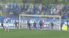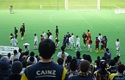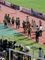 そんな中、前掛かっていた愛媛DFの裏へ出されたロングボールを、金選手がポストとなって前方へフィードした所でトミッチ選手に倒されてFKを得ます(前半34分)。流れが悪いならセットプレーがあるじゃないか。ボールポイントはゴールほぼ正面で距離は30m程です。距離的には松下選手なんですが、ここはヘベルチ選手が蹴りに行きます。遠目に見てもヤル気満々です(笑)。ヘベルチ選手、前傾姿勢で突っ込んだ助走の後、左足を強く打ち込みシュート発射!撃ち出されたボールは3人の壁の横を勢い良く突き抜け、GKの正面へ飛びます。このシュート、球威があっただけでなく、GKの前で大きく落ちます。GK・秋元選手、さすがに掴みきれず、ボールは前へこぼれます。弾んだこぼれ球に突進、最初に到達したのはなんとリンコン選手。右足でボールを蹴った直後にGKと交錯。しかしボールはゴールマウスへと吸い込まれてGOOOOOAL!!! 草津がファーストチャンスで見事に先制!(前半35分)。ただ、殊勲のリンコン選手はピッチに臥したまま、自力で起き上がれません。前半39分、結局ピッチアウトしていたリンコン選手は負傷のためそのまま交代となり、急遽小林選手が投入されます。なにやら出血しているらしいとの事で、非常に心配です。劣勢の中起死回生の一撃をものにし、勢いを取り戻せるかと思われましたが、愛媛の攻勢は収まりません。前半39分、愛媛は右CKのチャンスです。ニアに蹴り込まれたボールは松下選手がクリアします。このセカンドボールを再度愛媛側が確保し、ゴール前へ入れてきます。ペナルティエリア内に落ちてきたボールを小柳選手が競るもクリアし切れず、園田選手にシュートを許します。やられた!しかし、今日は運もあるみたいです。失点確実と思われたシュートは、クロスバーに当たって弾き返されました。危ない所で難を逃れました(黒須くん良い仕事します^^)。前半42分、またしても愛媛は右CKを得ます。今度のCKはファーに落ち、フリーの村田選手がヘディングシュート。この場面はGK・北選手が体を投げ出して防ぎます(一瞬こぼした時はキモ冷やしたで^^;)。前半はシュート2本で1点を獲得した草津がリードを守ってハーフタイムとなります。前半の印象は愛媛の攻勢(シュート5本)を草津が受け止めいなしたと言った感じです。終了間際にゴールへ迫られましたが、全般的にはやられた感はありません。前線が停滞していたために受け身に回ってしまった、と言うのが実情でしょう。スクランブル交代ではありましたが、小林選手の登場によって守備的な雰囲気が払拭されれば、よりアクティブな試合が観られると思います。後半に期待。 後半最初のシーンは、開始直後に内田選手のチェックに保崎選手が切れてイエローカードを貰う場面です(オイオイ)。気持ちは分かりますが、そのカレー券は高く付くんです(主に金銭的な意味で)。自重自重。後半11分、櫻田選手がアタッキングサード・左サイドからDF裏へ縦パスを入れます。このパスに対して、ポストに入った小林選手がキープした後、マイナスにパスをセットします。このセットボールをヘベルチ選手がシュートしますが、相手DFに当たってこぼれます。しかし、ここ最近しつこさや泥臭さを取り戻してきた草津攻撃陣は、こう言ったオイシイシーンを見逃しません。この場面では、金選手がすかさず突っ込んでヘディングシュートへ持って行きます。シュートはDFに体を寄せられて左へ外れましたが、前を向く意識と行動のベクトルが一致した素晴らしいプレーと言えます。後半15分、愛媛はSB・内田選手が負傷のためFW・福田選手がピッチに入ります。嫌な選手が出てきました。後半19分、カウンターで左サイドを金選手が駆け上がり、櫻田選手とのワンツーパスでDFを引き剥がすと、再加速して敵陣深く疾駆します。金選手、相手を十分に引き付けた所で右サイドへ大きくチェンジするセンタリングを入れます。ここに快足でゴール前へ切り込んできた保崎選手がシュート!…に行きたかったんですが、侵入速度超過で体勢が整わず、足に当てて前へ転がすのが精一杯でした。それでも、ゴール前へ駆け込む姿には熱い漢の魂を感じましたよ。後半20分に愛媛、OMF・赤井選手→OMF・東選手、後半31分に草津、金選手→杉本選手、後半32分に愛媛、OMF・大山選手→OMF・加藤選手と、両陣営が次々と手札を切ってきます。なお、杉本選手は金選手の居たFWにそのまま入りました(おおっ、スギモン久々の「我が家」だぞ)。後半36分の草津はカウンターのチャンスです。左前方の無人エリアに蹴り入れたボールに永田選手が追い付き、相手DFを振り切ってゴール前へと侵入します。永田選手、ドリブルしながら中央に杉本選手、右サイド方向にヘベルチ選手が追い付いてくるのを待ってからファーサイドのヘベルチ選手が走り込む先へと送球します。ヘベルチ選手がこのボールをしっかり足元に入れられれば得点機となったんですが、ここは前野選手の体を張ったブ