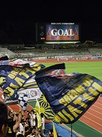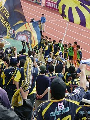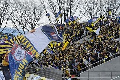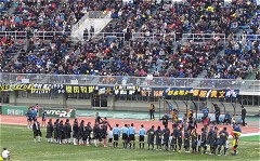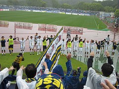 ザスパ草津は1勝2分け1敗で13位です。東京Vに勝ってひと桁の順位になるか、10位以下でズルズル順位を落としていくのか分水嶺の戦いです。昨年は同じ味の素スタジアムで、3対1でザスパが勝ちました。昨年と同じく、験を担いでJ1昇格目指す「特急草津号」で出陣です。今回は林勇介選手の出身中学の盛岡市立厨川中学校のサッカー部の大先輩の友達を誘っての観戦です。47年前に岩手県中体連で3連覇した黄金の時代のサッカー部主将です。味の素スタジアムに到着すると、スタメンが発表されました。林選手の名前があり、テンションは上がります。林選手の横断幕は2つ、ゲーフラは2つあり、元サッカー部主将は写真を撮りまくっていました。誘った私としては、一安心です。 怪我をした熊林選手の代わりに櫻田選手が入り、開幕戦と同じ1トップ3シャドーの布陣です。試合が開始されると、東京Vのパスサッカーに翻弄され押されっぱなしです。しかし最初の決定的場面はザスパでした。リンコン選手のパスに小林選手がDFをかわしシュートです。しかしGKが体ごとぶっかってきました。ドーンという音とともに、残念ながらボールは上に舞い上がりました。ゴール裏からは歓声が悲鳴に変わります。その後はやはり東京Vのパスサッカーに押されました。その時、相手ゴール裏から歓声が沸き起こりました。味の素スタジアムにはオーロラビジョンが2つもあります。そこにゴールシーンが映し出されます。それに依りますと、フリースローから東京Vは細かいパスを通して阿部選手がシュートしました。これを北選手がはじきますが、そこに西選手が詰めてゴールを決めたようです。ここ2試合得点の無いザスパにとっては、痛い失点です。その後は、ザスパが必死の反撃を開始します。28分にはゴール前でフリーになった松下選手が左足でシュートしますが、惜しくも右に外れます。前半終了間際にはリンコン選手がシュートするも、バーの上を越えていきます。林選手も左足でシュートをしますが、東京VのDF土屋選手にブロックされバーを緩く越えていきます。目の前にザスパの選手が次々現れ、シュートをサポーターに向けて打ってくるのは迫力があります。J1規格の正田醤油スタジアムになると、ザスパ劇場が毎試合見られるようになるのでしょうか。 後半戦になると、ますますザスパ草津が攻勢をかけます。開始直後リンコン選手のシュートは左へ、65分には櫻田選手のシュートは右に外れます。そして74分に決定的な場面を迎えます。後藤選手からリンコン選手に楔パス、再び後藤選手から金成勇選手へパスが回りシュートしました。GKがはじいたボールを後藤選手がふたたびシュートします。ゴール決まったと思った瞬間、相手DFの右足に無情にも当たってはじかれてしまいました。ああ無情!神はザスパ草津に試練を与えたもうた。ザスパサポーターは悲嘆にくれました。その後もザスパは積極的に攻めます。しかし守備的になった東京Vを崩すことはできませんでした。終了直前にはパワープレーにでた隙をつかれ決定的2点目を献上してしまいました。ここで試合終了、残念ながら痛い敗戦です。サポーターに挨拶にきた選手達に、「切り替えろ」「これからだ」と優しい声、厳しい声がかけられました。厳しい戦いが続きますが、6位以内に入り、ぜひJ1昇格へ向けて選手サポーターが一丸となって頑張りましょう。【ざすっぱ@前橋】 |