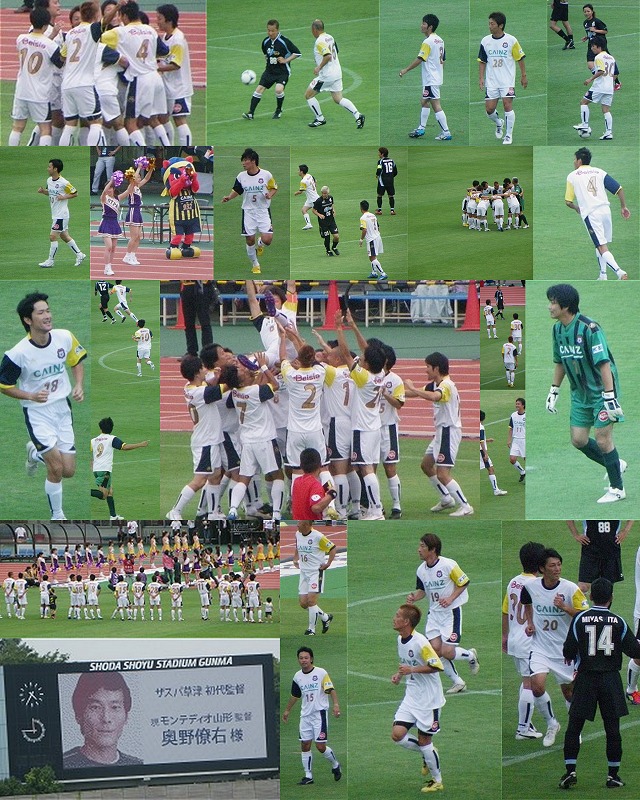 | いつ以来の感覚だろうか。今日は朝から気もそぞろで、まるで遠足に臨む子供のよう。ああ、これはそうだ、Jの舞台を目指して崖っぷちの戦いをしていたあの頃の感覚だ。そう、今日は「その頃の彼ら」が帰ってくる。僕らの10年間が、敷島に蘇る。 敷島に向かう国体道路から、何かいつもとは雰囲気が違う。公式戦今節の対戦相手である町田のサポさん達が大勢ご来場下さっているのは分かる。が、それ以上に草津サポの人数が明らかに多い。スタジアム正面の屋台村にてその状況は如実で、来場者数で低迷する今季が嘘のような盛況ぶりじゃないか。久しぶりにここに来たよと言う「かつての草津サポ」が至る所で談笑している。そうなんだね、10年という歳月でこのチームに関わる人は入れ替わって今に至っている。ここに立っているとそれが実感できる。 今日のスペシャルマッチに参集してくれた草津ドリームチームのメンバーを紹介しよう(なお、この観戦記では引退された方も“選手”と記述する)。GK:1・本田征治選手、22・小島伸幸選手、DF:2・籾谷真弘選手、4・齋藤竜選手、5・崔成勇選手、7・佐田聡太郎選手、18・寺田武史選手、MF:8・小久保純選手、10・高須洋平選手、15・山崎渡選手、19・大谷圭志選手、28・山口貴之選手、30・樹森大介選手、FW:9・高田保則選手、11・氏原良二選手、14・佐藤正美選手、20・吉本淳選手、監督・植木繁晴氏、トップコーチ・手塚聡氏、GKコーチ・山岸範之氏、主審・篠藤巧氏、副審・郡司厚太氏、宮崎渓仁氏。選手・監督・コーチ・審判の全てがザスパ草津の関係者なのも、積み重ねた年月を感じさせて感慨深い。 そして、今日のイベントマッチを快く引き受けて下さった、今やサッカーファンで知らぬもの無い有名サッカー集団・theミイラ。折角なので、簡単ではあるがこのチームの事を書いておきたい。このチームは、1980年代、低迷する日本サッカー界の活性化のため、漫画家・望月三起也氏、お笑い芸人・明石家さんま氏、ビートたけし氏らが発起人となって結成された。このチームの活動方針は、芸能人が日本リーグ(当時)などの前座試合に繰り出して注目を集め集客しようというものであるが、「本物のサッカーをじかに見てもらいたい」という真剣でぶれない趣旨の元で活動を続けている。この趣旨に賛同するサッカー関係者・芸能人が多く名を連ねる事からもその存在の大きさが知れるだろう。現在も各地で行われるサッカー関連イベントでのエキシビションマッチを展開しており、直近では浦和レッズOBとの試合を行ったばかりでもある。ちなみに、チーム名の「ミイラ」であるが、芸能人を目的にスタジアムへ来たファンをサッカーファンにしてしまおう→ミイラ取りがミイラになるという事に由来している。 試合開始前に、ザスパ草津初代監督である奥野僚右氏からのメッセージ(録音)が流される。僕個人は、この人に惹かれてザスパ草津に創始期から関わるようになった経緯があるので、久しぶりに聴いた氏の声になんだかドキドキもし、かつ胸に去来するものもあった。次々と歌い上げられる懐かしい選手コール。その全てが失われたscore(歌譜)のごとく、僕らの記憶野からスルスルと引き出されて行く。歌声は思い出と共に、と良く言うが、いや、ホントその通りだね。それぞれの選手コールを歌う度、その選手にまつわる思い出が蘇ってくるではないか。 |