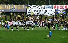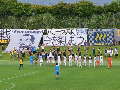 天皇杯初挑戦となった2010年。3回戦、上武大学に1−2。大きな志を抱きつつも敷島のピッチにさえ立てずに敗退。決勝までたどり着いた2011年。アルテ高崎に0−6の大敗。JFLとの力の差をまざまざと見せつけられた。アルテ高崎の解散という悲報とは裏腹にチャンス到来かと思われた2012年。決勝でtonan前橋に1−2で惜敗。まだまだ大きな経験の差を感じた。そして、4度目の挑戦。2013年8月25日、敷島公園県営サッカーラグビー場。ついに、ついに!悲願達成! チャレンジャーズは歴史の扉を開けた。 曇り時々晴れ。さわやかな風に秋の気配がかすかに感じられるものの、雲が流れるとまだまだ強烈な夏の日差しが肌を刺します。目の前には紺黄のユニフォームを纏い、真っ赤に日焼けした11人の戦士たち。ザスパ草津チャレンジャーズ、スタメンは、GK:21・後藤聡志、DF:2・久富良輔、3・安田光、4・小林誠、6・小西達也、7・横山輝佳、MF:13・深澤大樹、14・城田匠、19・藤井惇、FW:9・中川貴晴、11・小林雄剛。サブには、GK:1・長谷直輝、DF:29・木村直樹、MF:10・吹田諒、15・白井拓路、16・イナミネ アントニー。選手登録されている木村監督を含めた総勢16名。チャレンジャーズの全員が決勝の舞台に揃いました。対するは、関東リーグ1部のtonan前橋。昨年チャレンジャーズの目の前に立ちはだかった元草津戦士の氏家選手はまだまだ健在です。そして今年は"情熱の砦"田中淳選手が加入、CBとしてスタメン出場です。チャレンジャーズを応援していながらもどうしても彼らのプレーは気になってしまいます。しかし懐かしい彼らも今日だけは敵。 決勝戦のキックオフ。立ち上がりはtonanペースで試合が進み、強烈なシュートが何度となく浴びせられます。流石は関東リーグで経験をつんでいるチーム、しっかりシュートまで持ってゆきます。しかしこれを冷静に処理すると徐々にチャレンジャーズのペースに。果敢さと俊敏さに勝るチャレンジャーズがボールを支配し、tonanがこれを受けて立つという展開に。サイドから前線へボールを集めますが、ゴールには結びつかず。ここでチャレンジャーズに立ちはだかるのはパッション田中淳。忌々しいくらい的確に攻撃の芽を摘み、はね返してゆきます。 両者譲らず、スコアレスのままあっという間に前半終了。ペースを握られてはいてもtonanはうまさと力強さが光ります。ちょっとした隙を見逃してくれない鋭い反撃が怖い。一気にゴールに迫りシュートで終わる。決定機の多さはtonanに分があると感じられます。セットプレーも制空権を支配、しかしチャレンジャーズ各選手はしっかり体を寄せて自由にはさせていないという印象です。 さて後半スタート。両チームとも選手交代もなく布陣も変わらず。そのまんま前半のつづき、といった印象で推移する試合にちょっとツイートなんぞしようとした50分。歓喜の時が訪れます。GOOOOOAL!!! チャレンジャーズ先制! ...ええ、見逃しましたとも。あの場にいながら歴史的な先制ゴールを見逃しましたよ。藤井選手の距離のあるフリーキックをドンピシャのダイビングヘッドで久富選手が押し込んだのを...。あんなにきれいなゴールだったのに。 ...こんなんが観戦記なんか書いてていいんきゃ?(苦笑)さてさて、先制したチャレンジャーズは城田選手に代えて吹田選手を投入。縦横無尽に駆け回り、失点で前掛かりになりかけたtonanを翻弄します。前半半ばから日が陰ることがなくなり、強い日差しの下、消耗戦の様相を呈してきます。運動量が落ちてくる選手、足が攣る選手が出てきます。61分には中川選手に代わって白井選手がピッチに入ります。そんな中、途中出場の吹田選手はますます軽快に駆け回ります。82分、DF裏に抜け出した吹田選手に対し、大きなストライドで追うtonan田中選手。追いつきはしたもののペナルティエリア手前、ファールでとめるのが精一杯。このプレーでこの日2枚目のイエローで退場となります。 ゴール正面の好位置でのフリーキック。小西選手、短い助走から蹴られたボールは壁の上を越えてゴール左上に突き刺さる。GOOOOOAL!!! 追加点! ...うん、今度はしっかり見たで! 湧き上がる客席、高まる手拍子。勝利へのカウントダウンです。しかし関東リーグ1部のtonanも易々と勝たせてはくれません。前半から再三見せつけていた強さと鋭さと高さがはまり、ロスタイムに1点を返します。しかしそこまで。タイムアップ! ザスパ草津チャレンジャーズ、2−1で勝利! 優勝です! ホイッスルが鳴った瞬間に選手たちが駆け寄ったのは、バックスタンド側で声を出し続けていたサポーターの元でした。今日だけでなく、長年にわたり常にチャレンジャーズのために声を上げ続け、ポジティブな言葉をかけ続けたあたたかいサポーターたちと、抱き合い歓喜を分かち合います。そして号泣しながら木村監督に「ありがとうございます」と繰り返す後藤選手。4年間チャレンジャーズで天皇杯に挑み続けた彼だからこそ感じる想いがあったのでしょう