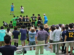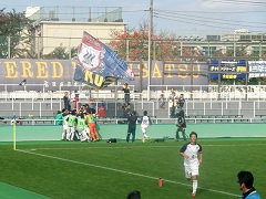 3日連続の試合も今日が最終日、決勝の舞台はかつてのジェフのホームスタジアム。今は「ゼットエーオリプリスタジアム」と名称こそは変われど、施設そのものは10年前に訪れたときと何も変わっていないので逆に古さが際立つ。相手は地元の千葉県代表ということだが、観客の比率でいえば完全にアウェイジャック。今日は鳴り物もOKとのことで、チャレンジャーズの試合では久々に太鼓の音とチャントが響くなか試合開始。決勝なので(そしてもともとの人数も少ないので…)、当然ベストメンバーで臨むザスパのフォーメーションは3-4-3。スタメンはGK長谷、DF村山(新)・小林・アンドレ(新)、MF川瀬(新 ※2010〜12ザスパU-23に在籍していた川瀬翔太くんの弟)・福田(新)・藤井・西山、FW吹田・白井・小野(新)。 試合は互いに攻めるものの、なかなか決定的なチャンスが作れず。相手にもサイドをえぐられるシーンが幾度かあり、観ているこちらはヒヤヒヤ。ただ、さすがは決勝戦、見応えのあるゲームにはなっている。前半は0対0で終了。 後半に入り、3連戦の疲れも加わりスピードが落ちるザスパ。相手のプレッシャーも強く、なかなかセンターラインから前にボールが出せない時間帯が続く。観客席からも「今日ばかりはさすがに延長か、さもなければPKか」という声がチラホラ。そんななかでも選手達は必死に声を出し、気持ちを高揚させ、残りの力を振り絞り攻め続ける。逆境に強い彼らなら、きっとチャンスをものにできるはず…今はそれを信じて応援するのみ。 徐々にザスパ優位になりつつあった後半29分、遂に決定的なチャンスが訪れる。右サイドからのクロスにFW24小野選手が合わせてGOOOOOAL!!!