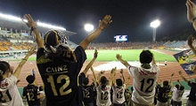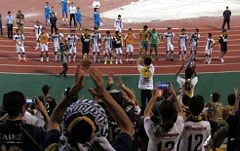 駒場スタジアムへと向かうオフィシャルツアーのバスで流れたのは、10年前、天皇杯の試合映像だった。大久保、西澤、森島らを擁するセレッソ大阪相手に、2-1の逆転勝利を飾り、あの伝説の横浜Fマリノス戦へ・・・。むざむざ負けに行くとは思っていまいが、まさかこの後行われる本番の試合で、同じような展開が繰り広げられると考えていた者は、どのくらいいただろうか。奇跡のVゴールから10年。当時を知る現役選手はGK北のみとなり、J1王者マリノス相手に、決勝点を押し込んだ依田は、コーチとしてこの試合を迎えた。実に6年ぶりに初戦を突破し、J1チームへの挑戦権を得た、今年の天皇杯。その相手は、直前のリーグ戦でJ1首位に立った、浦和レッズ。これまで2度、PSMで対戦したことはあるが、公式戦はこれが初めて。クラブの経営規模、観客動員数、これまでの実績、どれをとってもザスパの果てしなく上を行く、日本でナンバー1のサッカークラブ。そのレッズとの真剣勝負を待ち望んでいたザスパサポーターも多いはず。その想いが、とうとう実現することとなった。 その待望の一戦は、レギュラーシーズンの合間を縫う形で、平日水曜の夜に行われた。直前のリーグ戦では、FC岐阜相手に0-2のビハインドからエデル、そして4ヶ月ぶりにピッチに戻ってきたエース平繁の、涙の復活ゴールで試合終了直前にドローに持ち込み、リーグ終盤に向けて光が見えたばかり。中2日という非常に厳しい日程ながら、選手の試合に臨むモチベーションは高い。もちろん、サポーターもこの一戦にかける想いは強く、参戦しにくい日程ながら、出島と呼ばれるアウェイ専用席は、続々と訪れるザスパサポーターで埋まり、メインスタンドにもザスパのユニフォームを着た同志が集まってきている。対するレッズサポーターも、キックオフ時間が近づくにつれて、徐々にスタンドを埋めていく。さすがに満員とはならなかったが、紺色の一部以外、一階部分はぐるっと赤色が囲んだ。強豪レッズとの対戦を前に、秋葉監督はここ最近リーグ戦で採用している4バックではなく、相手に合わせた3バックのフォーメーションを選択。GKは天皇杯2回戦の栃木戦での活躍から、ここのところ継続してゴールマウスを守る富居、3バックには黄誠秀、クォンハンジン、そしてケガから戻ってきた有薗が久しぶりの先発。両ワイドにはおなじみの小柳と瀬川、ダブルボランチに坂井と加藤。ワントップに長身のエデルがケガ明け初のスタメン、2シャドーには運動量豊富な小林と宮崎が入った。控えにはダニエルロビーニョ、青木孝太ら。前の試合で復活を遂げた平繁は、ベンチにも入らなかった。連戦になることを考慮したか、まだ万全ではないのか。ペドロビッチ監督をはじめ、柏木、槙野ら、広島時代同じユニフォームを着た仲間との対戦は、本人も楽しみであったろうに、それは叶わなかった。また、途中加入のカイケは、3回戦の登録期限以後に加入したため、この試合は出場できない。厳しい日程の中、この対戦のために用意したスペシャルな布陣で臨む。 対するレッズも、首位争いをするリーグ戦を重視してか、前の試合からスタメン9人を交代。とは言え、GKは日本代表の西川、坪井や那須など経験豊富なベテラン、濱田や山田直輝など生え抜きの若手、そしてトップは李忠成と、十分強力な布陣。そして控えには槙野、宇賀神、柏木ら、普段のレギュラーメンバーが控えている。 日本列島は暑さがぶり返し、大気の状態が不安定。メインスタンド裏では雷光が見え隠れしている。時折弱い風は吹くが、日が落ちても30℃前後という、連戦には厳しいコンディションとなった。試合開始が近づくにつれて、両サポーターの声も大きく響くようになる。ザスパ伝統の草津節をかき消すように、レッズサポーターの足並み揃った歌声が響き、浦和と真剣勝負ができるという実感が湧いてくる。NHK-BSで生中継されるこの試合は、改めてザスパクサツ群馬という存在を世間に知らしめる大きなチャンス。クラブ、選手、サポーター、それぞれの想いを胸に、試合開始のホイッスルを聴いた。立ち上がりからボールを支配するのは浦和。ザスパは5バックと言っていいほど、小柳、瀬川の両ワイドが下がり、3バックと一列の最終ラインを形成する。2列目にはボランチ二人と2シャドーが横に並び、トップのエデルが余る。無理にプレッシャーをかけず、コンパクトなラインでスペースを消して、浦和の速い攻撃に備えている。マイボールになっても無理な縦パスは送らず、後方でのパス回しでうまく時間を使いながら、エデルのキープや宮崎の裏への飛び出しを狙うが、GK西川の的確な判断でチャンスは未然に防がれ、通ると思ったパスも判断良くカットされてしまう。浦和も無理には仕掛けてこないものの、守備ラインの綻びを見つけては、右サイドから関口、中央からは山田が突破を図る。ザスパ陣内でパスミスやトラップが大きくなると、すかさずゴー