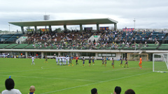 負けるべくして負けた試合だった。2015年の天皇杯1回戦。ザスパは東海1部リーグに所属するFC岐阜SECONDと対戦。前半2点のリードを許し、相手を大きく上回る数のシュートを放ちながら1点しか奪えず、早々に大会を去ることになった。しかも、3日前のリーグ戦に続き、1週間のうちにFC岐阜のトップとセカンドに、立て続けに苦杯を飲まされる結果となった。天皇杯で下位カテゴリのクラブと戦うのは非常に難しい。毎年ジャイアントキリングと呼ばれる逆転現象が起こる。何よりザスパは身に染みてそのことをわかっているはず。かつてはJリーグチャンピオンの横浜Fマリノスを下し、昨年は当時J1首位だった浦和レッズに堂々の逆転勝利を果たした。逆に、高校生チームに負けたこともある。わかっているからこそ、この試合、特に前半の戦いには失望を感じずにはいられなかった。 連戦となったザスパは、リーグ戦と大きくスタメンを替えて試合に臨んだ。GK北、右SBに久富、CB乾と小柳、左SBに夛田。ダブルボランチはアクレイソンと黄誠秀。左ハーフに横山、右に永井、トップ下に吉濱。ワントップは小牟田。リーグ戦9得点の江坂はベンチスタート、富居、青木、小林亮、松下、坂井といった、ここのところスタメンに定着している選手はベンチからも外れている。もちろんコンディションを考慮して、というところもあるだろうが、残りのリーグ戦、さらには来シーズン以降に向けて、服部監督が更なる成長の期待を込めて選んだ陣容であることが、サポーターにも感じ取れた。情報の少ない対戦相手、しかも大物食いを演じようとモチベーション高く臨んでくる相手に対して、序盤はどうしても受け身になる。いかに早く相手の力量を見極め、こちらのペースに持ち込めるかがポイントだった。 朝から雨が降っていたが、試合開始前には上がり、会場となった群馬県立サッカー・ラグビー場には約1,000人の観衆が集まった。芝生席に腰を下ろして観る試合は、ザスパの創成期を彷彿させる。この日も太鼓を使った応援ができないため、声と手拍子のみで選手を後押しするサポーター。この雰囲気の違いも、少なからず試合展開に影響を与えたかもしれない。 そしてキックオフ。開始早々に押し込んで吉濱がシュートを放つものの枠外、それ以降は球際やルーズボールへの反応で後塵を拝してしまう。相手はFWに当て、キープしたボールをサイドに展開するシンプルな攻撃。いつも通り、前線からプレスをかければ相手のミスを誘い、自分たちのペースに持ち込めるはずだが、ボランチやサイドでの対応が遅れ気味になり、ボールを奪うことができない。跳ね返したセカンドボールを拾われ、さらに押し込まれる。そうこうしているうち、空いた中盤を使われ、バイタル中央でボールキープを許すと、豪快なミドルシュートが決まり、開始から11分で先制点を許してしまう。 ザスパはワントップの小牟田が競ったボールをキープできず、厚みのある攻撃ができない。右サイドの永井と久富のコンビで何度かクロスを上げるものの、中央で合わず、ファーで待ち受けた横山のシュートは、相手DFが体でブロックする。 この日はパスのズレも多く、結果、後手を踏んで相手の有利な状況を与えてしまう。24分、奮闘していた永井が足を引きずり、早くも大津と交代。その直後、自陣右サイドの少し遠い位置で与えたFK。枠を捉えたボールを北がはじくが、ザスパの選手より早く相手選手がルーズボールに反応し、シュート。これで2-0。結果的に決勝点となったこの失点が、敗因を最も象徴するシーンとなった。 2点のビハインドとなったザスパだが、DFラインの不安定さと前線でのタメのなさは変わらず。何度か決定機を迎えるが、クロスバーと相手の粘り強い守備の前に、得点が奪えない。結局そのまま前半を終了してしまう。ザスパの選手にとっては想定外の事態だったろう。ピッチとの距離が近いスタンドからは、両チームの表情の違いが明らかだった。生き生きとプレーする岐阜SECONDの選手たちに対して、焦燥の色が見えるザスパの選手たち。一つ一つのプレーにも、その違いが如実に反映されていた。ザスパは3点以上取らないと勝ちはない。一発勝負のトーナメント、負けたらそこで終わり。後半開始早々から交代枠を使ってくるかと思われたが、服部監督は当初送り出した選手に賭けていた。しかし、試合の趨勢はあまり変わらない。64分左SBの夛田に替えて、川島を投入。悪いながらも地力に勝るザスパが、徐々に岐阜SECONDを追い詰め始めると、66分、その川島のロングスローから、DF裏に抜けた大津がゴール右隅にシュートを決め、GOOOOOAL!!! 1点を返す。ここを勝負どころと見た服部監督は、すかさず小牟田に替えて、エース江坂を投入、一気に形勢逆転を狙う。 ここからは守る岐阜SECOND、攻めるザスパという構図が続く。幾度のなく訪れる好機、しかし、もう少しのところでタイミングが合わない。放ったシュートはバーをはじ