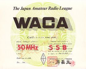 SJJGに入会したのは、1986年の末、JCCはWkd400の頃だった.HQQに見せてもらった会報の「WACAまでの軌跡」は感慨深く、いつかは自分もと、思っていたが、まさかこんなに早くできてしまうとは、当時は夢にも思わなかった.(右はWACA完成記念QSLカード)
